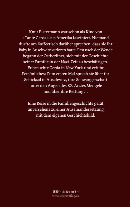 Am Anfang steht ein Tabubruch: Das Kind fragt seine "Tante Gerda" aus Amerika, gerade zu Besuch in der DDR, wie sie ihr Kind im KZ verloren habe. Die Kaffeegäste schweigen entsetzt. 30 Jahre später besucht Knut Elstermann Gerda in New York und stellt ihr diese Frage erneut. Er berichtet von engen Familienbanden der Vorkriegszeit, vom Überleben jüdischer Freunde und Bekannte, aber auch von Deportation und Tod: In Auschwitz musste Gerda dem Sterben ihres neugeborenen Kindes tatenlos zusehen. Sie entkam dem Todesmarsch - ein Wehrmachtssoldat beschützte sie. Es ist die Geschichte einer Suche nach Wahrheit in Akten und Zeitzeugenberichten sowie in der eigenen Erinnerung. -Sie versteckte sich vor den Nazis, überlebte Auschwitz - 60 Jahre später fand sie erstmals die Kraft, darüber zu sprechen.