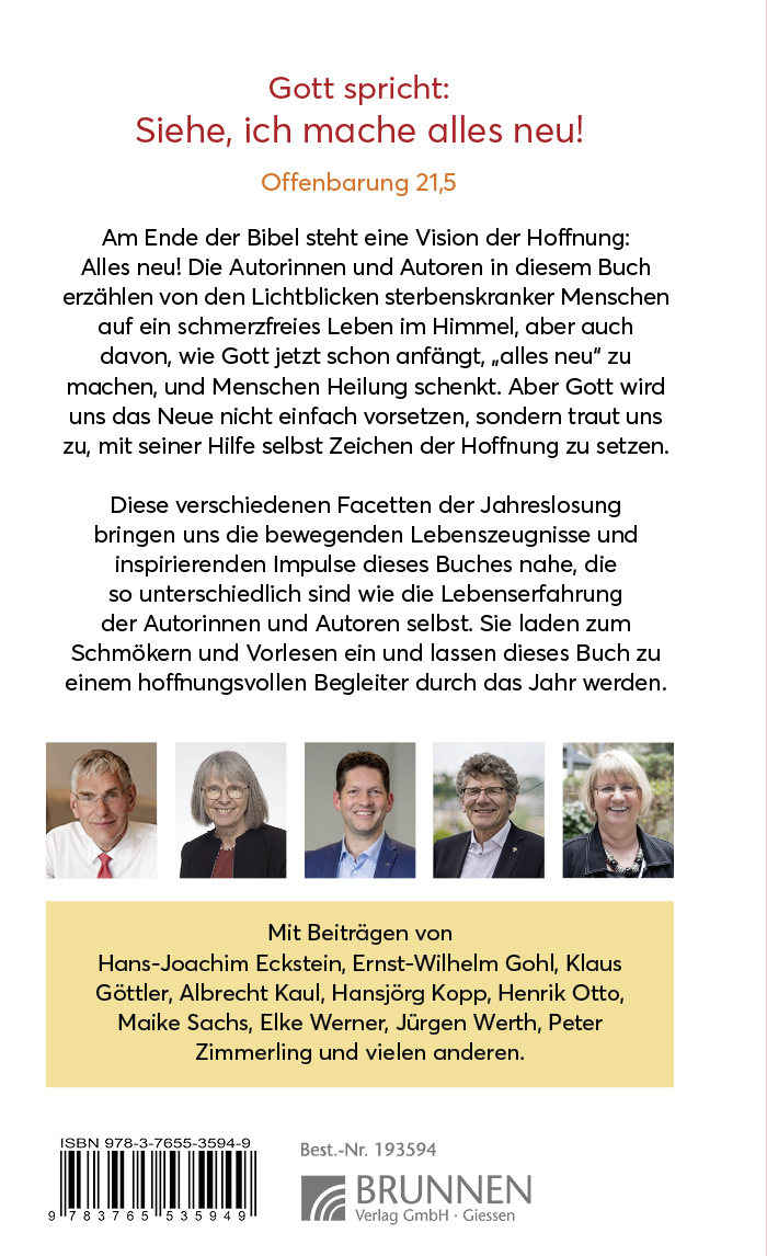 Die Jahreslosung 2026 vermittelt Hoffnung! Und von dieser Hoffnung erzählen die Autorinnen und Autoren in diesem Buch: von der Hoffnung sterbenskranker Menschen auf ein schmerzfreies Leben im Himmel, der Hoffnung auf Heilung von einer Suchterkrankung. Aber auch von der Hoffnung auf blühende Landschaften in der ehemaligen DDR nach der Wende.