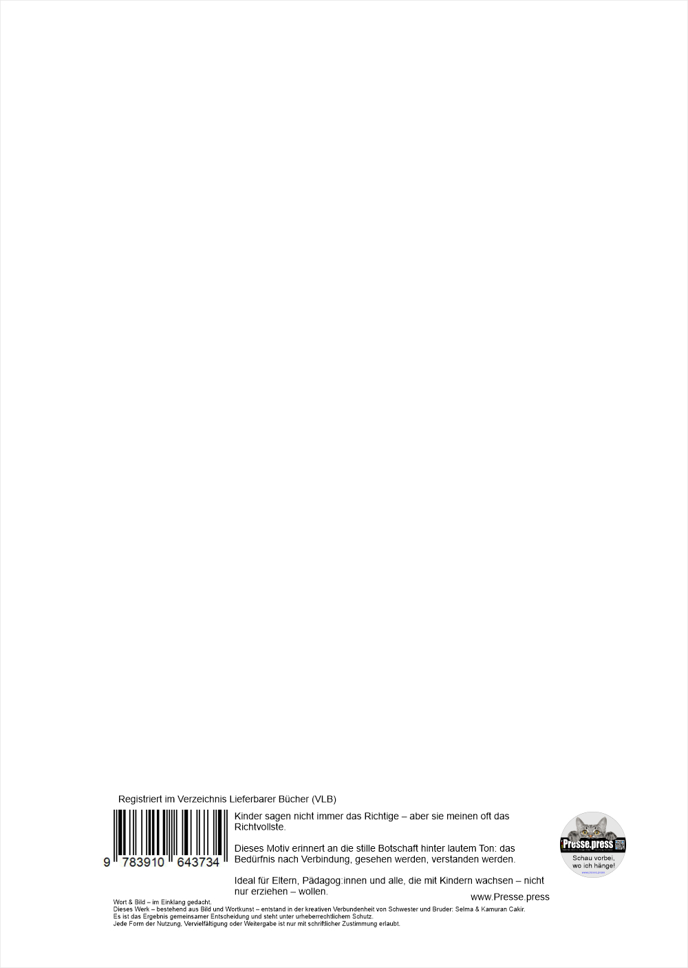 | Zusatzinfo | Kinder sagen nicht immer das Richtige – aber sie meinen oft das Richtvollste. Dieses Motiv erinnert an die stille Botschaft hinter lautem Ton: das Bedürfnis nach Verbindung, gesehen werden, verstanden werden. |