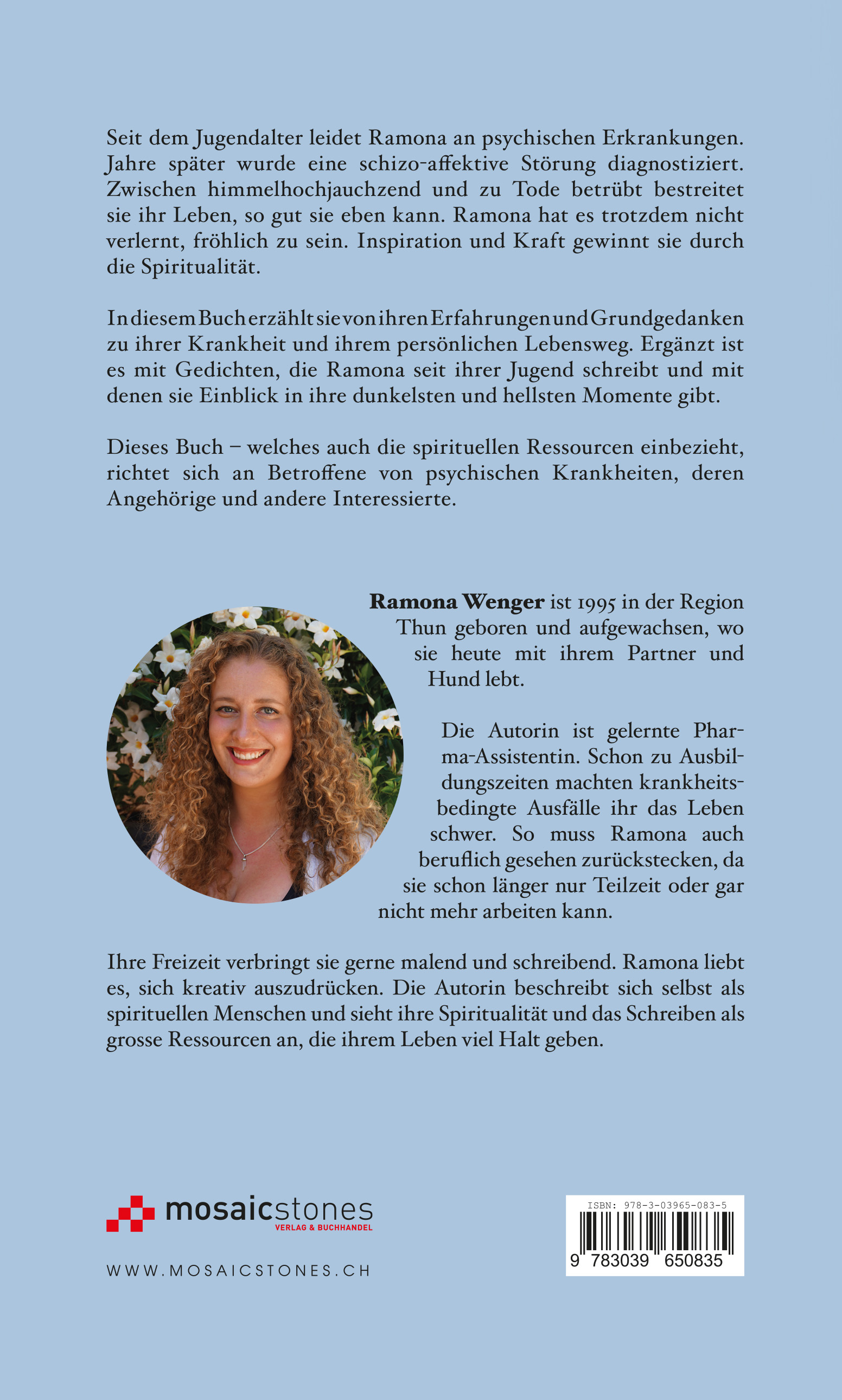 In diesem Buch erzählt sie von ihren Erfahrungen und Grundgedanken zu ihrer Krankheit und ihrem persönlichen Lebensweg. Ergänzt ist es mit Gedichten, die Ramona seit ihrer Jugend schreibt und mit denen sie Einblick in ihre dunkelsten und hellsten Momente gibt.