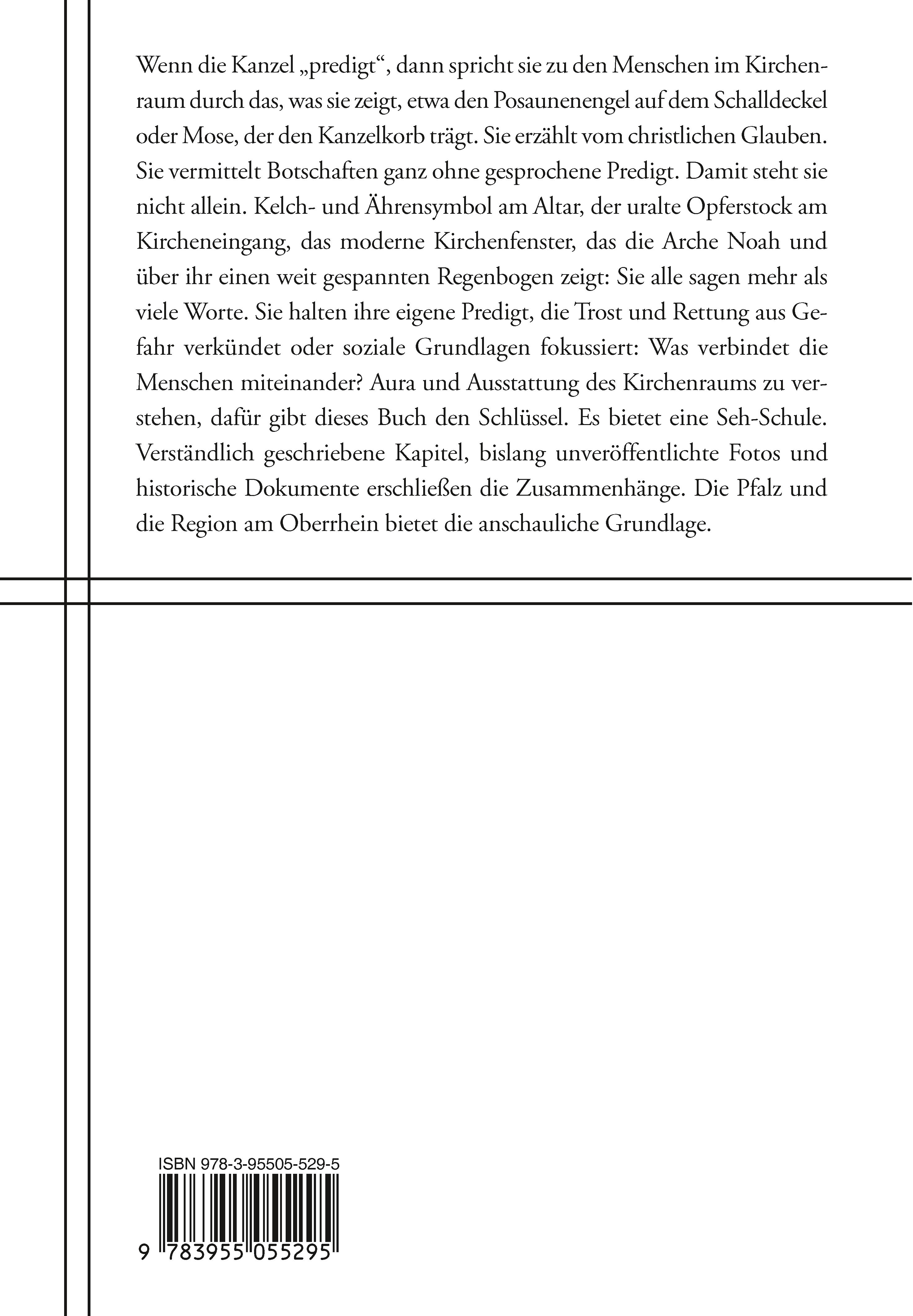 Wenn die Kanzel "predigt", dann spricht sie zu den Menschen im Kirchenraum durch das, was sie zeigt, etwa den Posaunenengel auf dem Schalldeckel oder Mose, der den Kanzelkorb trägt. Sie erzählt vom christlichen Glauben. Sie vermittelt Botschaften ganz ohne gesprochene Predigt. Damit steht sie nicht allein. Kelch- und Ährensymbol am Altar, der uralte Opferstock am Kircheneingang, das moderne Kirchenfenster, das die Arche Noah und über ihr einen weit gespannten Regenbogen zeigt: Sie alle sagen mehr als viele Worte. Sie halten ihre eigene Predigt, die Trost und Rettung aus Gefahr verkündet oder soziale Grundlagen fokussiert: Was verbindet die Menschen miteinander? Aura und Ausstattung des Kirchenraums zu verstehen, dafür gibt dieses Buch den Schlüssel. Es bietet eine Seh-Schule. Verständlich geschriebene Kapitel, bislang unveröffentlichte Fotos und historische Dokumente erschließen die Zusammenhänge. Die Pfalz und die Region am Oberrhein bietet die anschauliche Grundlage.