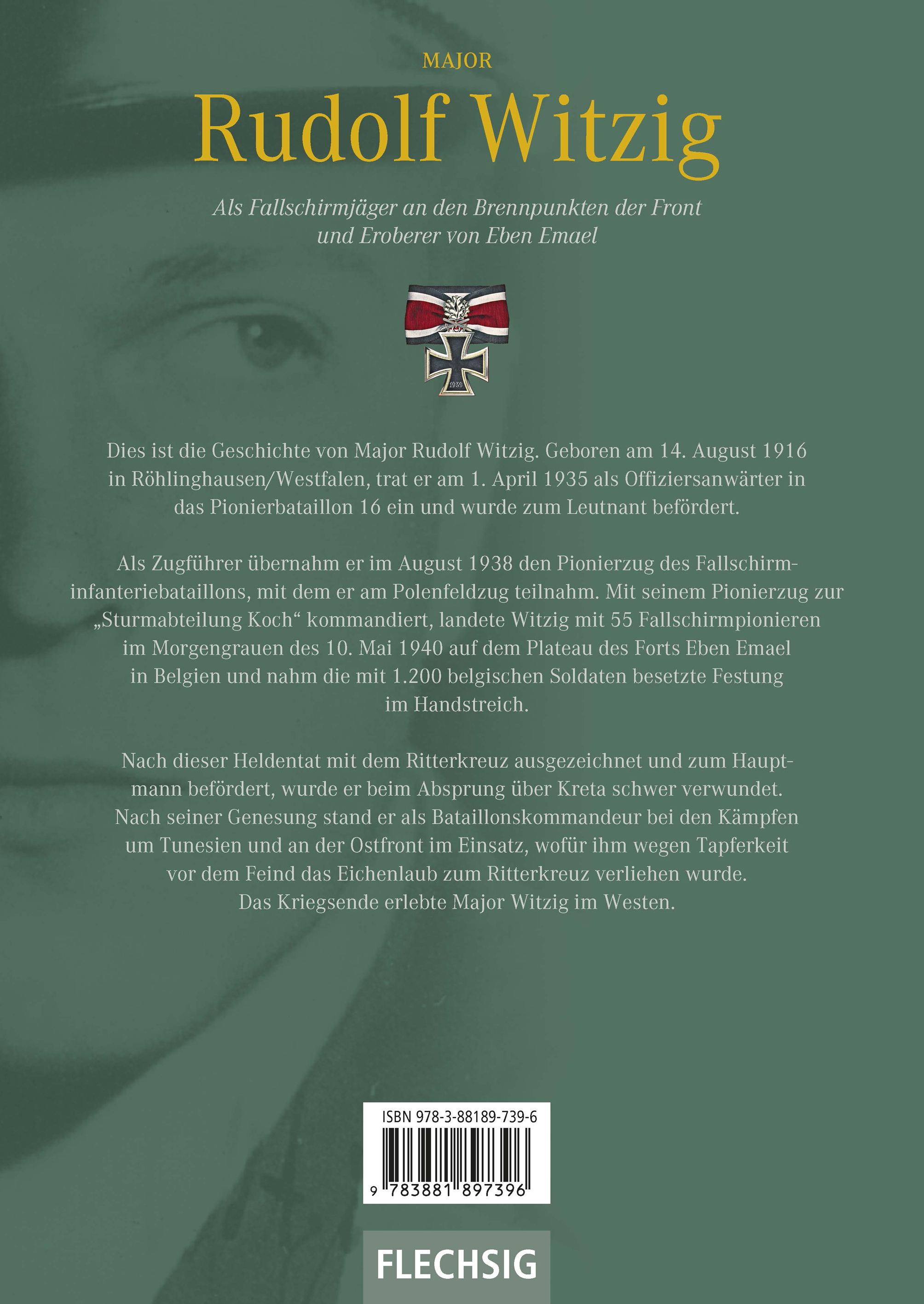Dies ist die Geschichte von Major Rudolf Witzig. Geboren am 14. August 1916 in Röhlinghausen/Westfalen, trat er am 1. April 1935 als Offiziersanwärter in das Pionierbataillon 16 ein und wurde zum Leutnant befördert. Als Zugführer übernahm er im August 1938 den Pionierzug des FschInfBtls mit dem er am Polenfeldzug teilnahm. Mit seinem Pionierzug zur "Sturmabteilung Koch" kommandiert, landete Witzig mit 55 Fallschirmpionieren im Morgengrauen des 10. Mai 1940 auf dem Plateau des Forts Eben Emael in Belgien und nahm die mit 1.200 belgischen Soldaten besetzte Festung im Handstreich. Nach dieser Heldentat mit dem Ritterkreuz ausgezeichnet und zum Hauptmann befördert, wurde er beim Absprung über Kreta schwer verwundet. Nach seiner Genesung stand er als Bataillonskommandeur bei den Kämpfen um Tunesien und als Regimentskommandeur des FschJgRgts 5 an der Ostfront im Einsatz, wofür ihm wegen Tapferkeit vor dem Feind das Eichenlaub zum Ritterkreuz verliehen wurde. Das Kriegsende erlebte Major Witzig als Kommandeur des Fallschirmjägerregiments 18 im Westen.
