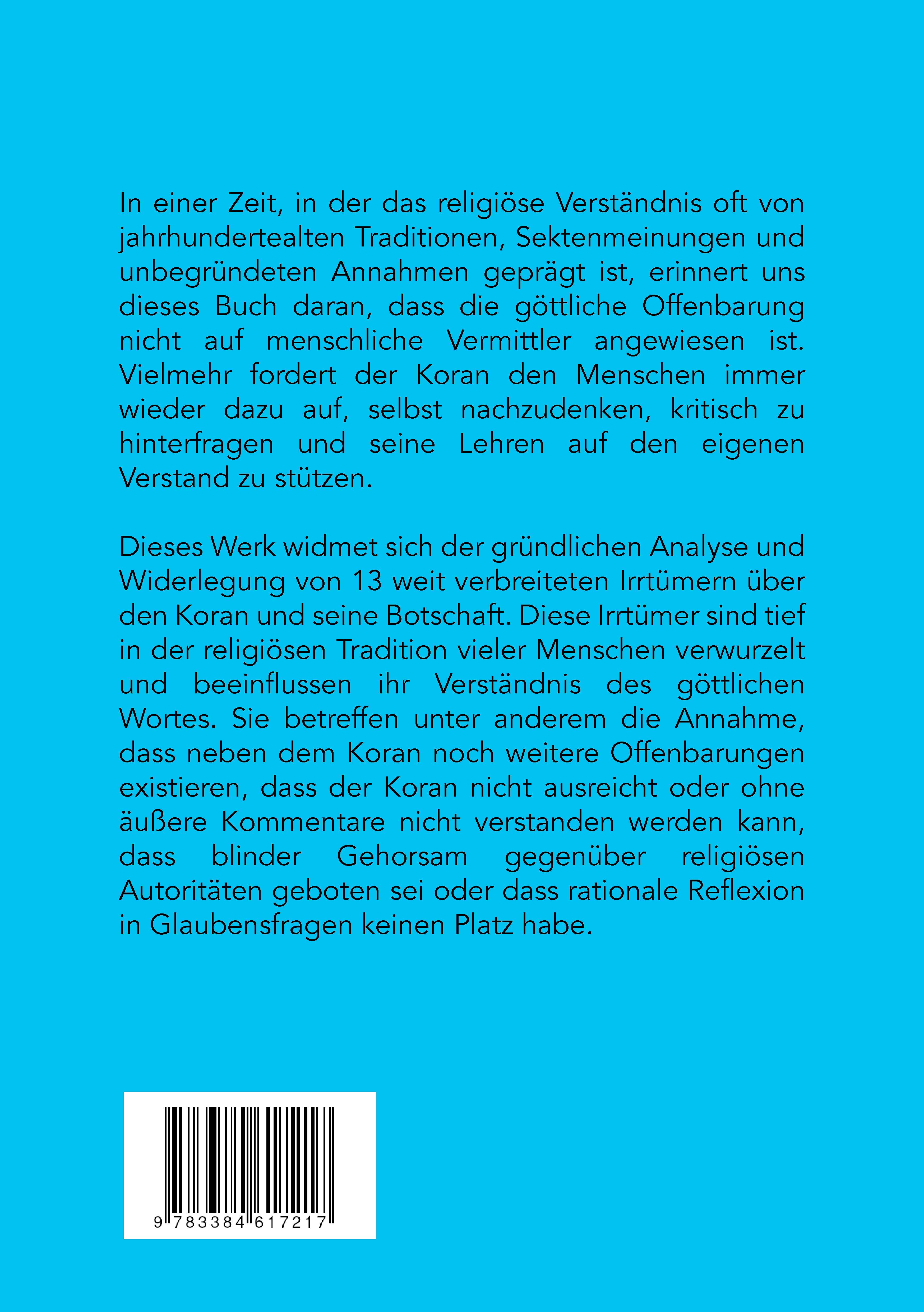 Das Buch zeigt anhand von 13 typischen Irrtümern, wie Muslime den Koran oft missverstehen oder falsche Annahmen über seine Botschaft machen. Es widerlegt weitverbreitete religiöse Missverständnisse und ruft dazu auf, sich ausschließlich am Koran zu orientieren - ohne menschliche Ergänzungen, Traditionen oder Interpretationen. Der Autor liefert Beweise direkt aus dem Korantext, dass dieser allein genügt, um als Wegweiser für das Leben zu dienen.