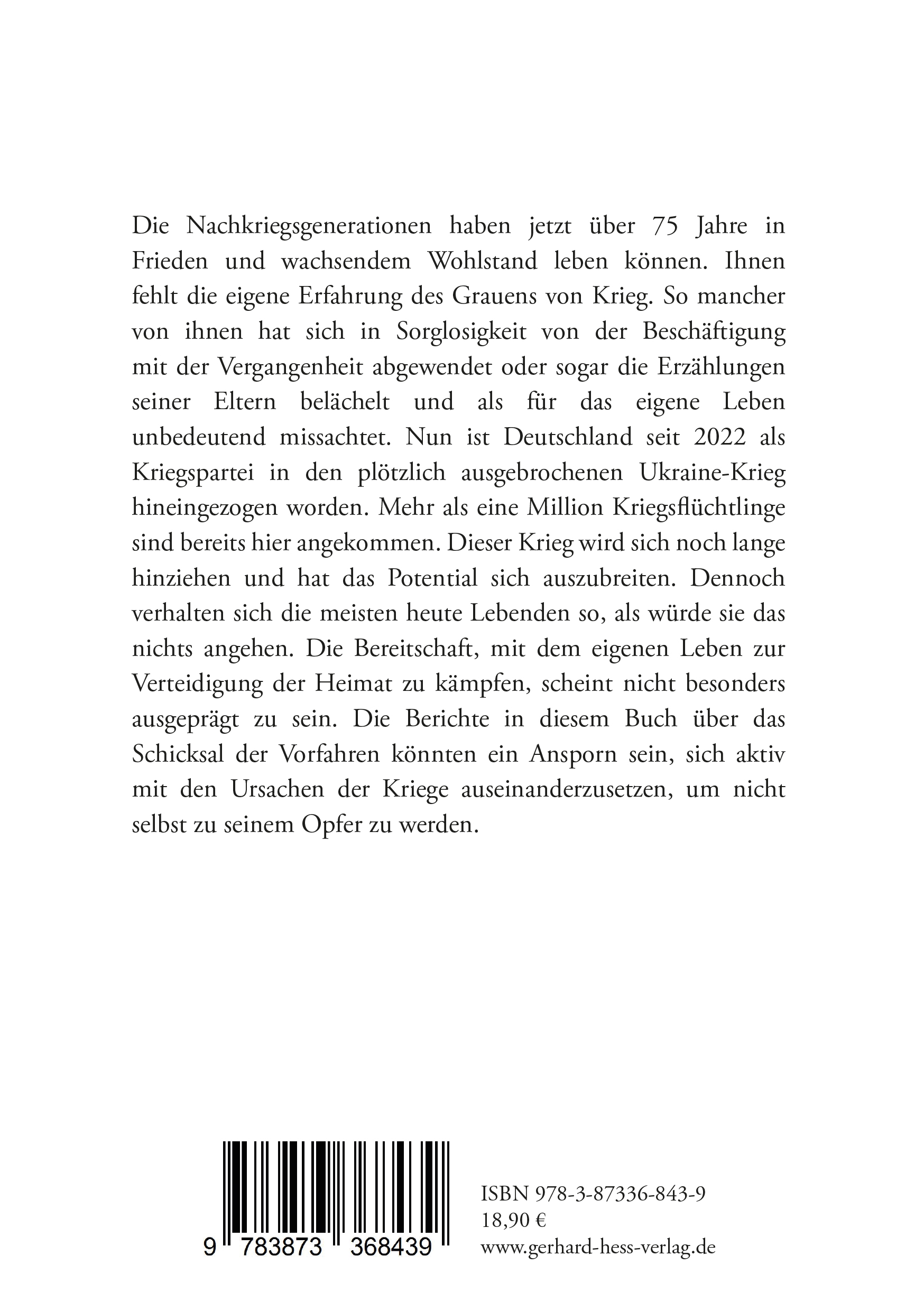 Die Nachkriegsgenerationen haben jetzt über 75 Jahre in Frieden und wachsendem Wohlstand leben können. Ihnen fehlt die eigene Erfahrung des Grauens von Krieg. So mancher von ihnen hat sich in Sorglosigkeit von der Beschäftigung mit der Vergangenheit abgewendet oder sogar die Erzählungen seiner Eltern belächelt und als für das eigene Leben unbedeutend missachtet. Nun ist Deutschland seit 2022 als Kriegspartei in den plötzlich ausgebrochenen Ukraine-Krieg hineingezogen worden. Mehr als eine Million Kriegsflüchtlinge sind bereits hier angekommen. Dieser Krieg wird sich noch lange hinziehen und hat das Potential sich auszubreiten. Dennoch verhalten sich die meisten heute Lebenden so, als würde sie das nichts angehen. Die Bereitschaft, mit dem eigenen Leben zur Verteidigung der Heimat zu kämpfen, scheint nicht besonders ausgeprägt zu sein. Die Berichte in diesem Buch über das Schicksal der Vorfahren könnten ein Ansporn sein, sich aktiv mit den Ursachen der Kriege auseinanderzusetzen, um nicht selbst zu seinem Opfer zu werden.