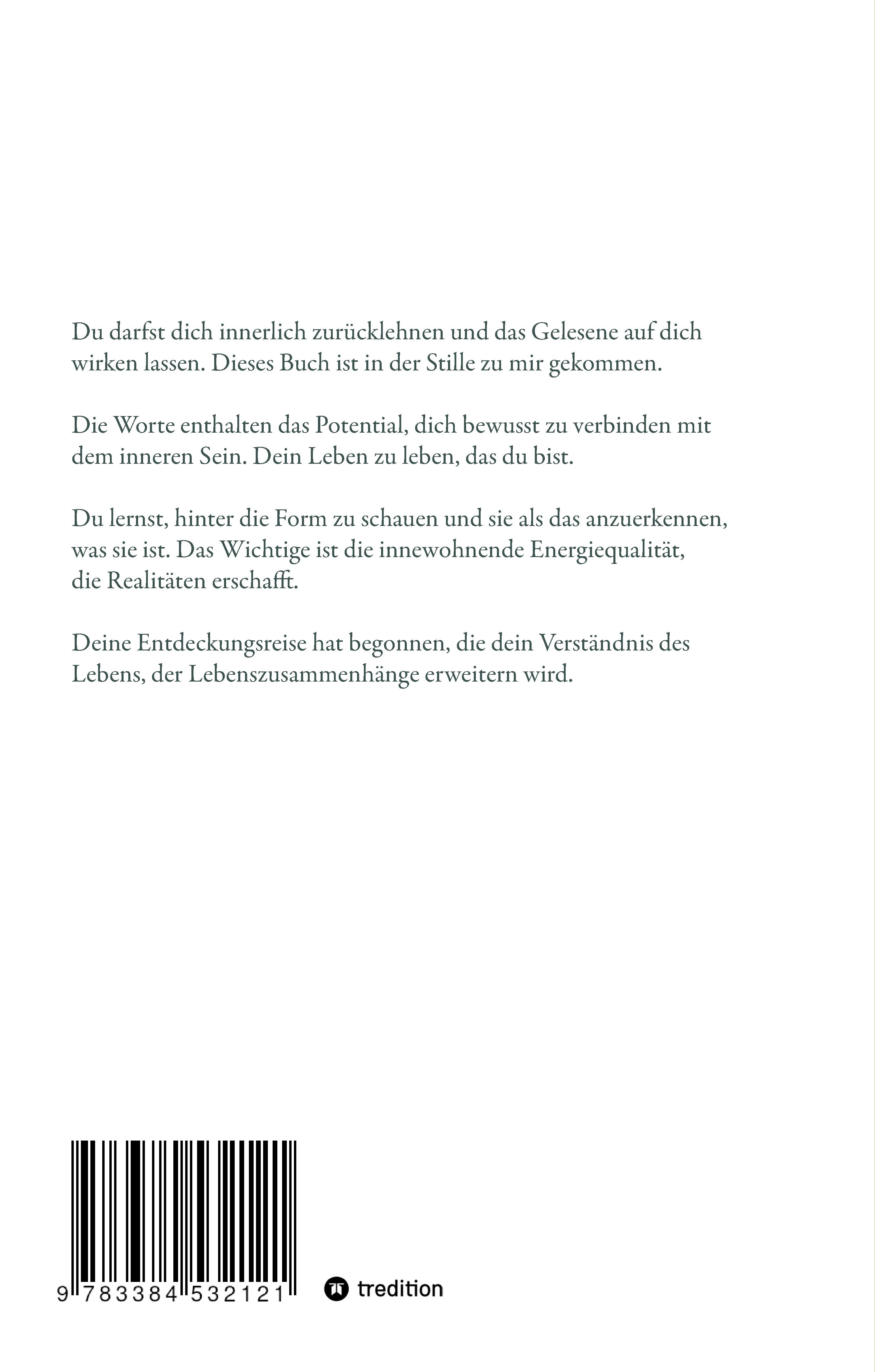 Das LebenEin Geheimnis, das darauf wartet, gelebt zu werdenDu darfst dich innerlich zurücklehnen und das Gelesene auf dich wirken lassen. Dieses Buch ist in der Stille zu mir gekommen. Die Worte enthalten das Potenzial, dich bewusst zu verbinden mit dem inneren Sein. Dein Leben zu leben, das du bist. Du lernst, hinter die Form zu schauen und sie als das anzuerkennen, was sie ist. Das Wichtige ist die innewohnende Energiequalität, die Realitäten erschafft.Deine Entdeckungsreise hat begonnen, die dein Verständnis desLebens, der Lebenszusammenhänge erweitern wird.
