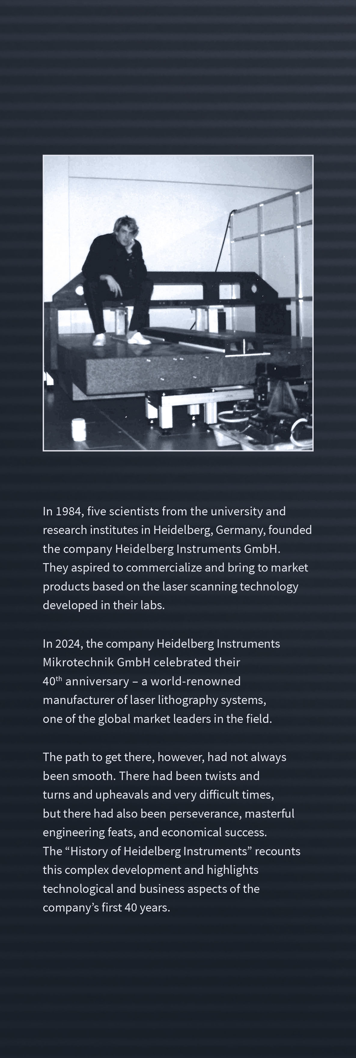In 1984, five scientists from the university and research institutes in Heidelberg, Germany, founded the company Heidelberg Instruments GmbH. They aspired to commercialize and bring to market products based on the laser scanning Technology developed in their labs.In 2024, the company Heidelberg Instruments Mikrotechnik GmbH celebrated their 40th anniversary - a world-renowned manufacturer of laser lithography systems, one of the global market leaders in the field.The path to get there, however, had not Always been smooth. There had been twists and turns and upheavals and very difficult times, but there had also been perseverance, masterful engineering feats, and economical success. The "History of Heidelberg Instruments" recounts this complex development and Highlights technological and business aspects of the company's first 40 years.