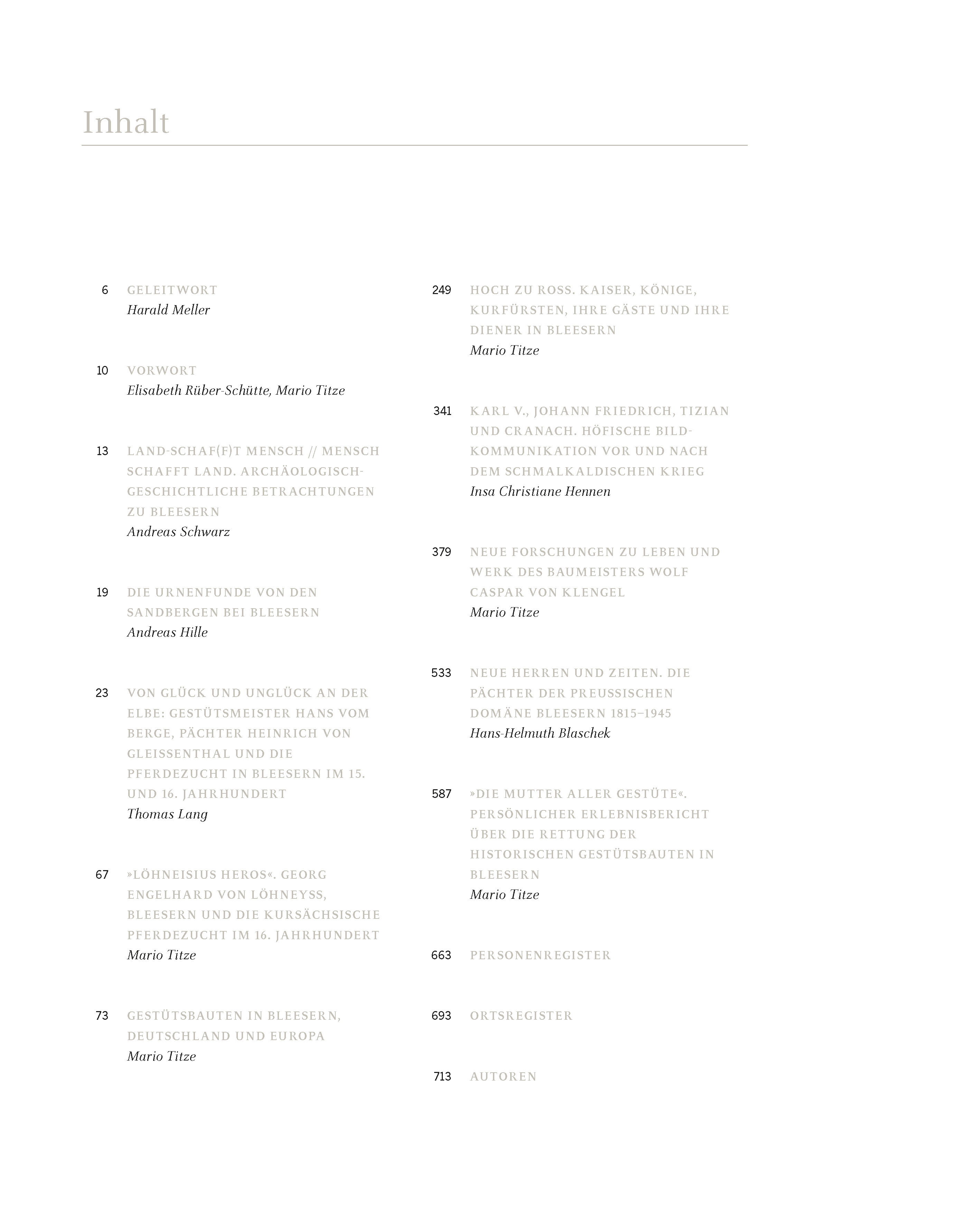 Mit dieser Publikation werden die Ergebnisse mehrjähriger Forschungen in einem Gemeinschaftsprojekt des Landesamtes für Denkmalpflege und Archäologie Sachsen-Anhalt und des Fördervereins Hofgestüt Bleesern e. V. vorgestellt. Der stattliche Band vereint die Früchte jahrelanger Archivrecherchen, intensiver Bauuntersuchungen, historischer und kunstgeschichtlicher Studien, die Auswertungen archäologischer Funde und umfangreiches Bildmaterial. Bleesern erscheint dabei in eine Reihe mit den berühmten Gestüten Deutschlands und Europas. Erstmals werden die Bau- und die Nutzungsgeschichte des kurfürstlichen Hofgestüts und des späteren Landgestüts, des Vorwerks und der Domäne Bleesern ausführlich vorgestellt. Erläutert werden die besondere Rolle, die Bleesern für die Pferdezucht und das damit verbundene Selbstverständnis der sächsischen Kurfürsten als Erzmarschälle des Heiligen Römischen Reichs spielte. Am Exempel Bleeserns werden die Geschichte der Pferdezucht seit dem Übergang vom späten Mittelalter zur Neuzeit ebenso wie die Bewirtschaftung eines agrarischen Großbetriebs des 19. Jahrhunderts in Preußen und die sich im Lauf der Jahrhunderte vollziehenden Veränderungen in der Landwirtschaft veranschaulicht. Archäologische Funde zeigen Bleesern sogar schon als Siedelplatz der späten Bronzezeit im 10. bis 8. Jahrhundert v. Chr. Vom 15. bis zum 19. Jahrhundert gehörte Bleesern zu den wichtigen Orten Sachsens, was sich nicht zuletzt an den Aufenthalten einer erstaunlich großen Zahl historischer Herrscher und anderer zum Teil illustrer Persönlichkeiten, darunter bedeutende Baumeister, ablesen lässt. Ein angemessenes herrschaftliches Wohnquartier bestand in dem 1578 von Christoph Tendler erbauten vierflügligen »churfürstlichen Haus« zwischen Vorwerk und Bleesern-See. Dieses Schloss von einem der wichtigsten sächsischen Renaissancebaumeister wurde 1765-67 bereits abgetragen und war bisher völlig unbekannt. Als einer der Hauptschauplätze des Schmalkaldischen Krieges war Bleesern auch mit den dynastischen Konkurrenzen zwischen den Wettinern und den Habsburgern verbunden, deren Auswirkungen sich in Werken Lucas Cranachs d. Ä. und Tizians nachweisen lassen. Eine ausführliche Monographie über Wolf Caspar von Klengel enthält zahlreiche neue Erkenntnisse zu seinem architektonischen Werk, in dem die Gestütsanlage Bleesern einen zentralen Platz einnimmt. Schließlich resümiert ein detailreicher Bericht die mitunter außerordentlich spannende und für viele andere hochrangige Objekte beispielhafte Geschichte des Ringens um den Erhalt des Denkmals und die dabei schließlich erreichten Erfolge.