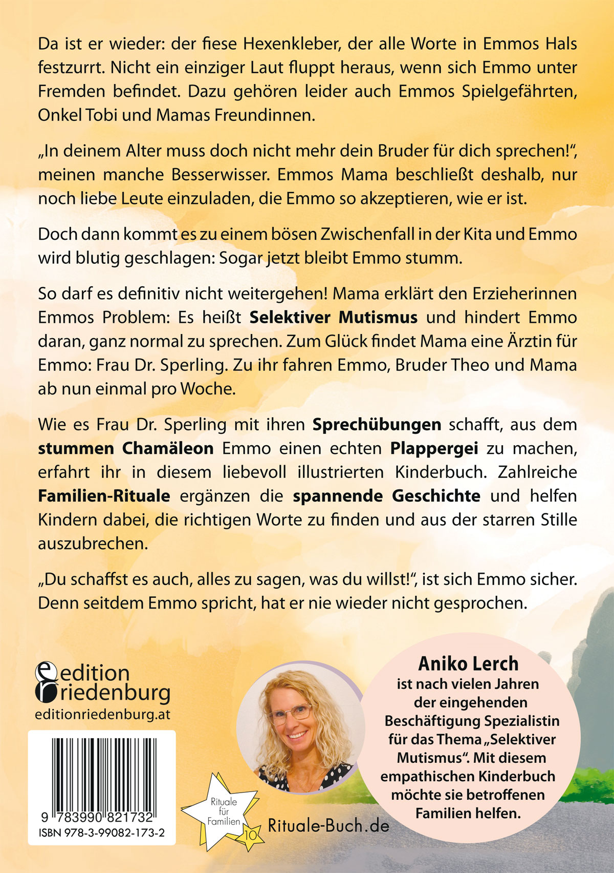 Aniko Lerch ist studierte Juristin und Autorin des Kinderbuchs über Selektiven Mutismus „Eine Kugel Schoko bitte!". Sie lebt mit ihrer Familie in Deutschland, Baden-Württemberg. Anikos eingehende Beschäftigung und Erfahrung mit dem Selektiven Mutismus bei Kindern vereinen sich in diesem liebevoll formulierten, bunt illustrierten Kinderbuch mit alltäglichen Ritualen für die ganze Familie. Damit werden die von Selektivem Mutismus betroffenen Familien gestärkt und bei dem Wunsch nach einem Leben mit „normaler“ Kommunikation unterstützt.