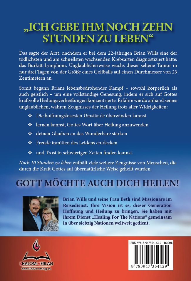 | Schlagworte | 9783947354429 • Beth Wills • Brian Wills • Gebete, Gebet • Healing for the Nations • Heilung • ISBN: 978-3-947354-42-9 • Krebs, Tumor, Krebstherapie • Noch 10 Stunden zu leben • Shalom-Verlag • Übernatürliche Heilung • Worte, Gebet |