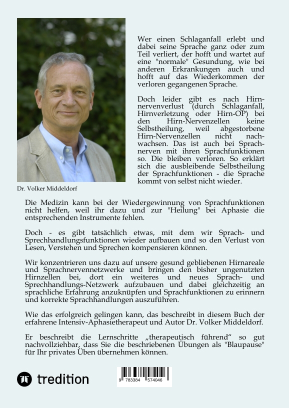 Bis 1990 habe ich als diplomierter Sprachheilpädagoge 16 Jahre lang in der Sonderschule für Sprachbehinderte gearbeitet, bis ich Kontakt bekam mit einem Menschen, der aufgrund seines hypoxischen Hirnschadens nicht nur fürchterlich starke Schmerzen aufgrund nicht nachlassender Muskelkontraktionen erleiden musste, der darüber hinaus psychisch sehr unter seiner schweren Aphasie (Sprachverlust) litt. Von diesem Moment an beschäftigten mich Menschen mit ähnlichem Schicksal und mit großem Bedarf nach intensiven Therapien. Mit Gründung des logopädisch-interdisziplinären Therapiezentrums, des 'LogoZentrums' in Lindlar, verließ ich meine Schule und führte im LogoZentrum Lindlar nur noch logopädische Intensiv-Therapie mit sprachgestörten Menschen 4 bis 5 mal täglich durch. Es kamen immer mehr Patient*innen mit Aphasie nach Schlaganfall und Schädelhirntrauma. Sie kamen alle wegen der mehrstündigen Sprachtherapien am Tag. Etwa 15 Jahre nach Eröffnung des LogoZentrums Lindlar wurde von wissenschaftlicher Seite unser intensives Therapie-Format als therapeutisch höchst erstrebenswert beschrieben. Trotz dieser "modernen" Erkenntnis aus aktuellen aphasiologischen Studien drang diese kaum in das deutsche Gesundheitswesen. Nach wie vor werden ärztlicherseits heilmittelrichtlinienkonform überwiegend nur 1 – 3 ambulante Aphasietherapie-Sitzungen pro Woche verordnet. Diese Therapiedosis reicht nachgewiesenermaßen hinten und vorne nicht aus für signifikante ambulante Sprachverbesserungen. Dafür braucht man 2 - 4 Sitzungen pro Tag und das über einige Wochen. Weil jedoch diese Therapiedichte von den Kostenträgern in der Regel nicht übernommen wird, habe ich kompensatorische Therapie-Lückenfüller gesucht. In Therapie-Studienprojekten (2006 bis 2017) konnten wir nachweisen, dass aphasisch betroffene Menschen neben der professionellen Aphasie-Therapie mit polimodalen "LogoMedien" ihre Sprache therapiewirksam weiter verbessern können. Zunehmend fragten unsere Patient*innen die Logovids® zum Selbstüben nach. Deshalb gab ich der Firma VMS GmbH, Lindlar, den Auftrag, 52 auf DVD existierende "sprechende Logovids®" (45 - 70 minütig) so zu transformieren, dass sie über Internet auch zu Hause preiswert abgerufen werden können. Gesagt - getan. Aus der Sammlung der von uns in der Praxis oft angewandten multisensorischen und wirkungsvollen Übungen habe ich die wichtigsten zusammengestellt. Und diese Übungs-Sammlung liegt Ihnen nun in Form der "Aphasie-Fibel" als Blaupause für Ihr Üben vor.