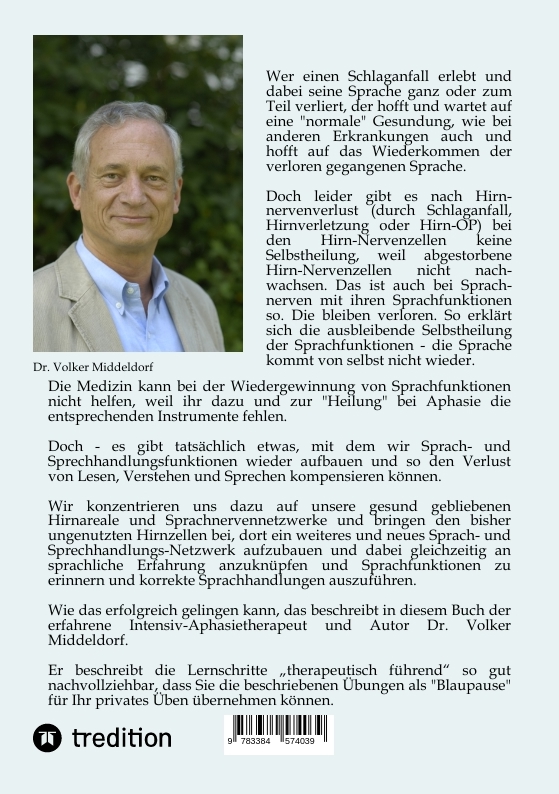 Bis 1990 habe ich als diplomierter Sprachheilpädagoge 16 Jahre lang in der Sonderschule für Sprachbehinderte gearbeitet, bis ich Kontakt bekam mit einem Menschen, der aufgrund seines hypoxischen Hirnschadens nicht nur fürchterlich starke Schmerzen aufgrund nicht nachlassender Muskelkontraktionen erleiden musste, der darüber hinaus psychisch sehr unter seiner schweren Aphasie (Sprachverlust) litt. Von diesem Moment an beschäftigten mich Menschen mit ähnlichem Schicksal und mit großem Bedarf nach intensiven Therapien. Mit Gründung des logopädisch-interdisziplinären Therapiezentrums, des 'LogoZentrums' in Lindlar, verließ ich meine Schule und führte im LogoZentrum Lindlar nur noch logopädische Intensiv-Therapie mit sprachgestörten Menschen 4 bis 5 mal täglich durch. Es kamen immer mehr Patient*innen mit Aphasie nach Schlaganfall und Schädelhirntrauma. Sie kamen alle wegen der mehrstündigen Sprachtherapien am Tag. Etwa 15 Jahre nach Eröffnung des LogoZentrums Lindlar wurde von wissenschaftlicher Seite unser intensives Therapie-Format als therapeutisch höchst erstrebenswert beschrieben. Trotz dieser "modernen" Erkenntnis aus aktuellen aphasiologischen Studien drang diese kaum in das deutsche Gesundheitswesen. Nach wie vor werden ärztlicherseits heilmittelrichtlinienkonform überwiegend nur 1 – 3 ambulante Aphasietherapie-Sitzungen pro Woche verordnet. Diese Therapiedosis reicht nachgewiesenermaßen hinten und vorne nicht aus für signifikante ambulante Sprachverbesserungen. Dafür braucht man 2 - 4 Sitzungen pro Tag und das über einige Wochen. Weil jedoch diese Therapiedichte von den Kostenträgern in der Regel nicht übernommen wird, habe ich kompensatorische Therapie-Lückenfüller gesucht. In Therapie-Studienprojekten (2006 bis 2017) konnten wir nachweisen, dass aphasisch betroffene Menschen neben der professionellen Aphasie-Therapie mit polimodalen "LogoMedien" ihre Sprache therapiewirksam weiter verbessern können. Zunehmend fragten unsere Patient*innen die Logovids® zum Selbstüben nach. Deshalb gab ich der Firma VMS GmbH, Lindlar, den Auftrag, 52 auf DVD existierende "sprechende Logovids®" (45 - 70 minütig) so zu transformieren, dass sie über Internet auch zu Hause preiswert abgerufen werden können. Gesagt - getan. Aus der Sammlung der von uns in der Praxis oft angewandten multisensorischen und wirkungsvollen Übungen habe ich die wichtigsten zusammengestellt. Und diese Übungs-Sammlung liegt Ihnen nun in Form der "Aphasie-Fibel" als Blaupause für Ihr Üben vor.