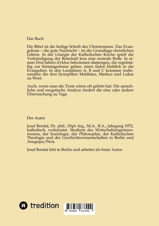 Die Bibel ist die heilige Schrift des Christentums. Das Evangelium - die gute Nachricht - ist die Grundlage christlichen Lebens. In der Liturgie der Katholischen Kirche spielt die Verkündigung der Botschaft Jesu eine zentrale Rolle. In den Gottesdiensten werden die Evangelien abschnittsweise gelesen.In einem Drei-Jahres-Zyklus bekommen diejenigen, die regelmäßig zur Sonntagsmesse gehen, einen tiefen Einblick in die Texte, sowohl in die der drei Synoptiker Matthäus, Markus und Lukas, die die jeweiligen Lesejahre A, B und C prägen, als auch ins Johannesevangelium, das gerade zu den Hochfesten theologisch wichtige Ergänzungen bietet.Im Heiligen Jahr 2025 habe ich mir die Perikopen im Einzelnen vorgenommen und sie auszulegen versucht, basierend auf früheren Überlegungen, ergänzt um sprachliche und exegetische Perspektiven, die mir während meines Studiums am Institut für Katholische Theologie der Humboldt-Universität zu Berlin (2020-2024) eröffnet wurden.