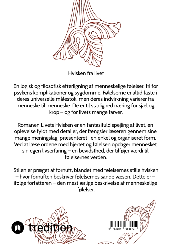 "Livets Hvisken"En logisk og filosofisk efterligning af menneskelige følelser, fri for psykens komplikationer og sygdomme. Følelserne er altid faste i deres universelle målestok, men deres indvirkning varierer fra menneske til menneske. De er til stadighed næring for sjæl og krop - og for livets mange farver.Romanen Livets Hvisken er en fantasifuld spejling af livet, en oplevelse fyldt med detaljer, der fængsler læseren gennem sine mange meningslag, præsenteret i en enkel og organiseret form. Ved at læse ordene med hjertet og følelsen opdager mennesket sin egen livserfaring - en bevidsthed, der tilføjer værdi til følelsernes verden.Stilen er præget af fornuft, blandet med følelsernes stille hvisken - hvor fornuften beskriver følelsernes sande væsen. Dette er - ifølge forfatteren - den mest ærlige beskrivelse af menneskelige følelser.