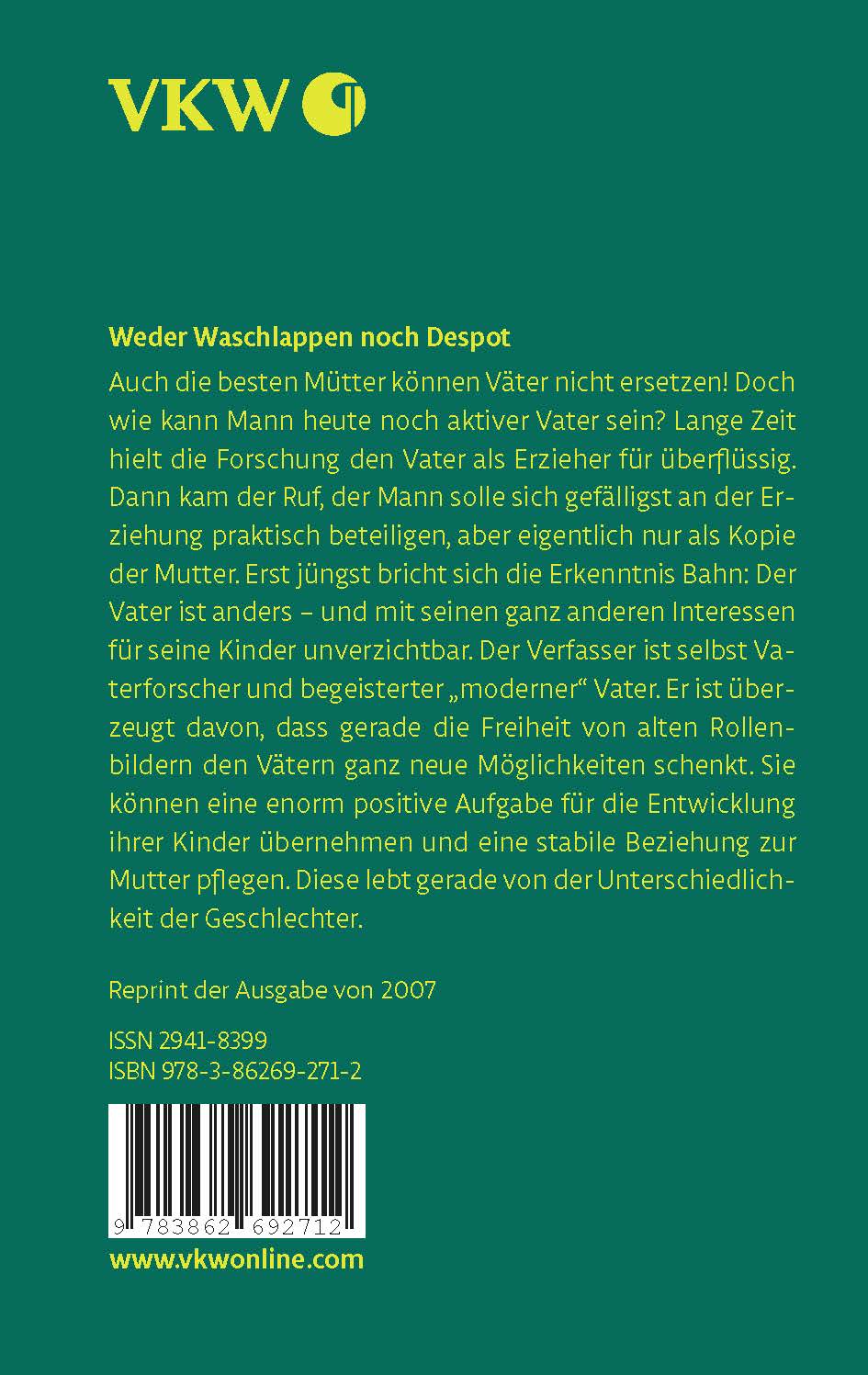 Auch die besten Mütter können Väter nicht ersetzen! Doch wie kann Mann heute noch aktiver Vater sein? Lange Zeit hielt die Forschung den Vater als Erzieher für überflüssig. Dann kam der Ruf, der Mann solle sich gefälligst an der Erziehung praktisch beteiligen, aber eigentlich nur als Kopie der Mutter. Erst jüngst bricht sich die Erkenntnis Bahn: Der Vater ist anders – und mit seinen ganz anderen Interessen für seine Kinder unverzichtbar. Der Verfasser ist selbst Vaterforscher und begeisterter „moderner“ Vater. Er ist überzeugt davon, dass gerade die Freiheit von alten Rollenbildern den Vätern ganz neue Möglichkeiten schenkt. Sie können eine enorm positive Aufgabe für die Entwicklung ihrer Kinder übernehmen und eine stabile Beziehung zur Mutter pflegen. Diese lebt gerade von der Unterschiedlichkeit der Geschlechter.