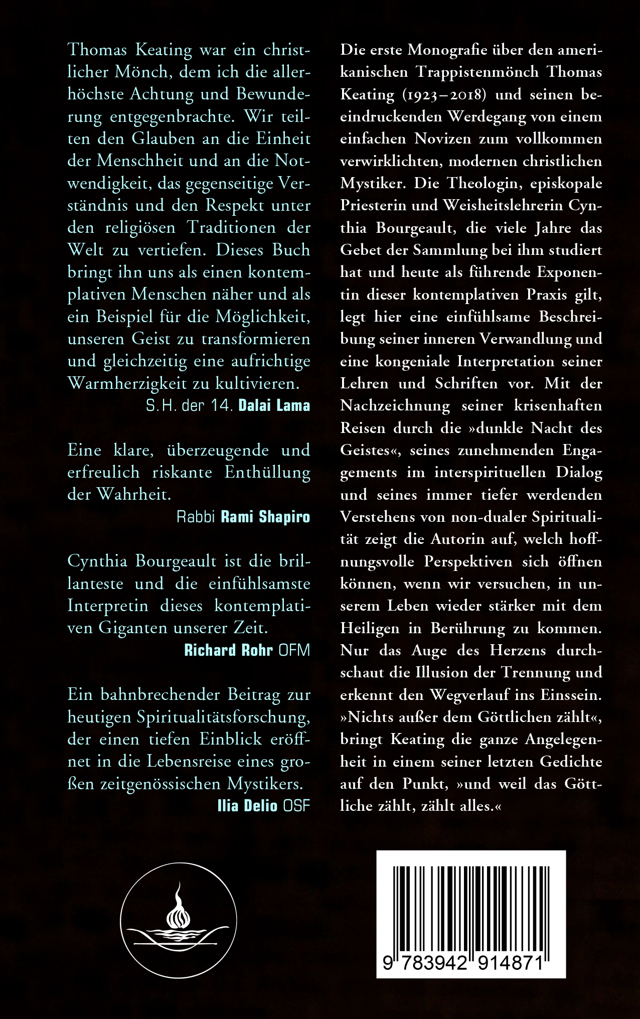 »Thomas Keating war ein christlicher Mönch, dem ich die allerhöchste Achtung und Bewunderung entgegenbrachte. Wir teilten den Glauben an die Einheit der Menschheit und an die Notwendigkeit, das gegenseitige Verständnis und den Respekt unter den religiösen Traditionen der Welt zu vertiefen. Dieses Buch bringt ihn uns als einen kontemplativen Menschen näher und als ein Beispiel für die Möglichkeit, unseren Geist zu transformieren und gleichzeitig eine aufrichtige Warmherzigkeit zu kultivieren« (Seine Heiligkeit der 14. DALAI LAMA).
