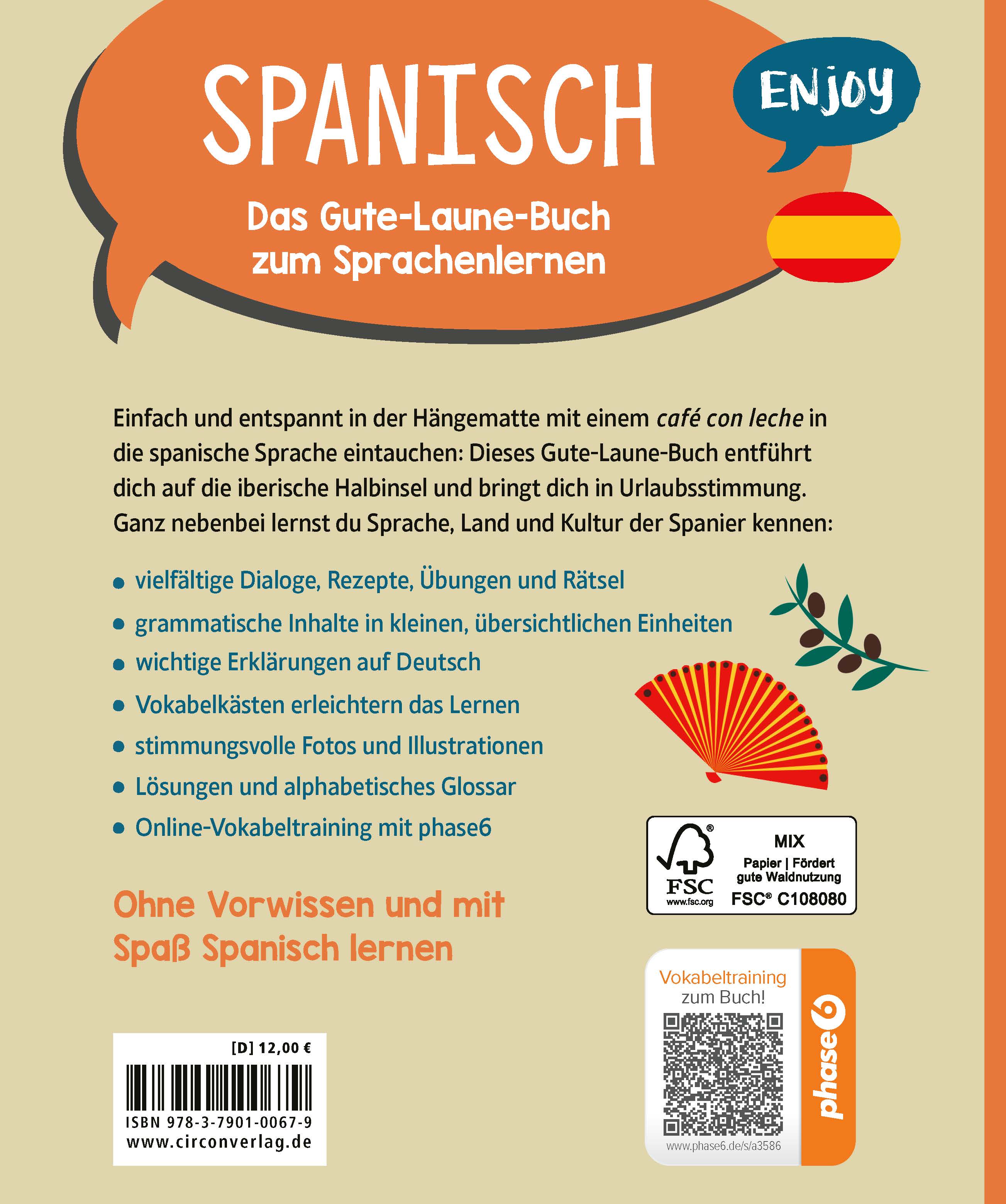 In diesem Buch werden Grundkenntnisse der spanischen Sprache vermittelt und mit vielen Fotos eine Wohlfühlstimmung erzeugt (wenig Grammatik und viel „Drumerhum“). Auch die ein oder andere Grammatikregel findet sich, aber vor allem der Spaß steht im Vordergrund – seien es Rezepte, Rätsel oder Witze. Hauptsache „fàcil“ – einfach und entspannt Spanisch lernen! Die spanischen Wörter werden im Vokabelkasten übersetzt, die Lösungen der Rätsel und Übungen sowie das alphabetische Glossar stehen im Anhang. Die Aussprache kann man mit phase6 üben.