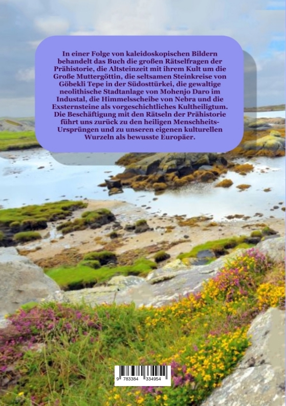 In einer Folge von kaleidoskopischen Bildern behandelt das Buch die großen Rätselfragen der Prähistorie, die Frage nach dem Ursprung der Menschheit, nach den versunkenen Kontinenten, nach den frühen menschlichen Hochkulturen mit ihrem verloren gegangenen Wissen. Behandelt werden die Altsteinzeit mit ihrem Kult um die Große Muttergöttin, die seltsamen Steinkreise von Göbekli Tepe in der Südosttürkei, die gewaltige neolithische Stadtanlage von Mohenjo Daro im Industal, die Himmelsscheibe von Nebra und die Exsternsteine als vorgeschichtliches Kultheiligtum. Die Beschäftigung mit den Rätseln der Prähistorie führt uns zurück zu den heiligen Menschheits-Ursprüngen und zu unseren eigenen kulturellen Wurzeln als bewusste Abendländer.