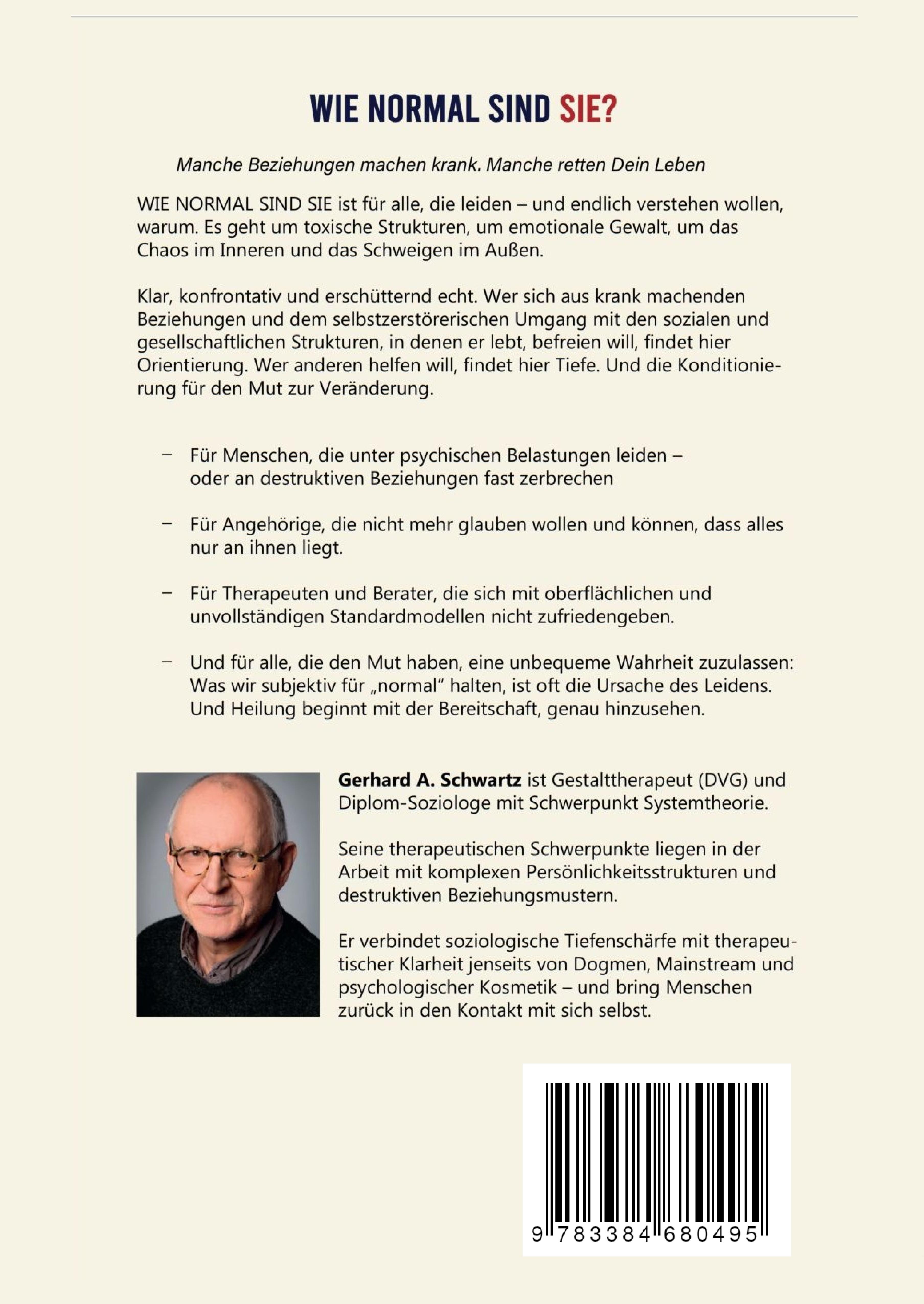 Wie krank ist unsere subjektiv wahrgenommene "Normalität"? Und wie heilend kann eine ehrliche Beziehung sein?"Wie normal sind Sie?" ist eine Zumutung - aber eine heilsame. Es richtet sich an Menschen, die psychisch leiden - und an diejenigen, die ihnen helfen wollen, an Angehörige, Partner:innen, Kolleg:innen und Eltern und nicht zuletzt an Therapeut:innen, Berater:innen und alle, die professionell mit psychischem Leid zu tun haben - und wissen: Die Standardantworten reichen längst nicht mehr aus.Teil 1: Die Realität, die keiner sehen willPsychisches Leiden hat viele Namen: Borderline, Narzissmus, Autismus, Depression. Doch oft beginnt es viel früher - in einer Beziehung, die subtil zerstört, ohne dass jemand hinschaut. Eine Mutter, die alles richtig machen will, aber emotional manipuliert. Ein Partner, der sich selbst als Opfer darstellt, während er andere systematisch ausbeutet. Ein "Familienklima", das außen harmonisch wirkt - und innen kalt, verwirrend und gewaltvoll ist.Teil 1 richtet sich an Betroffene - und an Menschen, die indirekt betroffen sind. In schonungslos klaren Worten und Fallbeispielen zeigt der Autor, wie destruktive Beziehungsstrukturen funktionieren - und warum viele erst dann heilen, wenn sie sich radikal davon lösen. Es geht nicht um Selbstoptimierung, sondern um Selbstschutz und das Recht auf ein klares Nein. Und manchmal um den Kontaktabbruch als therapeutischen Akt.Die zentrale These:Beziehungen sind die Ursache für psychisches Leiden. Und nur eine Beziehung kann auch wieder heilen, privat oder professionell.Die Soziologische Gestalttherapie integriert auf eine neue Art psychologische und soziologische Aspekte psychosozialer Probleme. Die dadurch veränderte, realistische Selbstwahrnehmung des Klienten im Rahmen einer authentischen, therapeutischen Beziehung führt zu einem befriedigenderen, ganzheitlicheren Umgang mit seinen sozialen und gesellschaftlichen Strukturen.Teil 2: Die Struktur hinter dem VerhaltenIm zweiten Teil wechselt die Perspektive: Hier geht es nicht mehr um einzelne Biografien - sondern um die dahinterliegenden Strukturen. Um das Zusammenspiel von Beziehung, Macht, Gesellschaft und Identität. Und um ein neues Verständnis psychischer Störungen jenseits von Diagnoseschablonen.Der Autor entwickelt eine kausalwissenschaftliche Struktur-Soziologie im Geist Émile Durkheims, weitergedacht mit Platon, Spinoza und Kurt Gödel. Dabei werden klassische Probleme des Strukturalismus - etwa das Verhältnis von Individuum und Gesellschaft - auf eine neue Ebene gehoben. Strukturen entstehen aus Interaktionen, gewinnen eine eigene Wirklichkeit und verursachen empirisch messbare Normalverteilungen im Verhalten/Denken/Fühlen. Veränderung? Entsteht durch andere Strukturen und Konditionierungen - nicht durch guten Willen.Diese Perspektive fordert heraus - vor allem in einem Feld, das sich oft hinter psychologischen Modellen versteckt, anstatt strukturelle Ursachen zu Ende zu denken und auf den Punkt zu bringen. Teil 2 richtet sich deshalb an das Fachpublikum: Menschen, die Therapie nicht nur als Methode, sondern als gesellschaftlich und individuell wirksame Gestaltung authentischer, realistischer Beziehungen verstehen können.