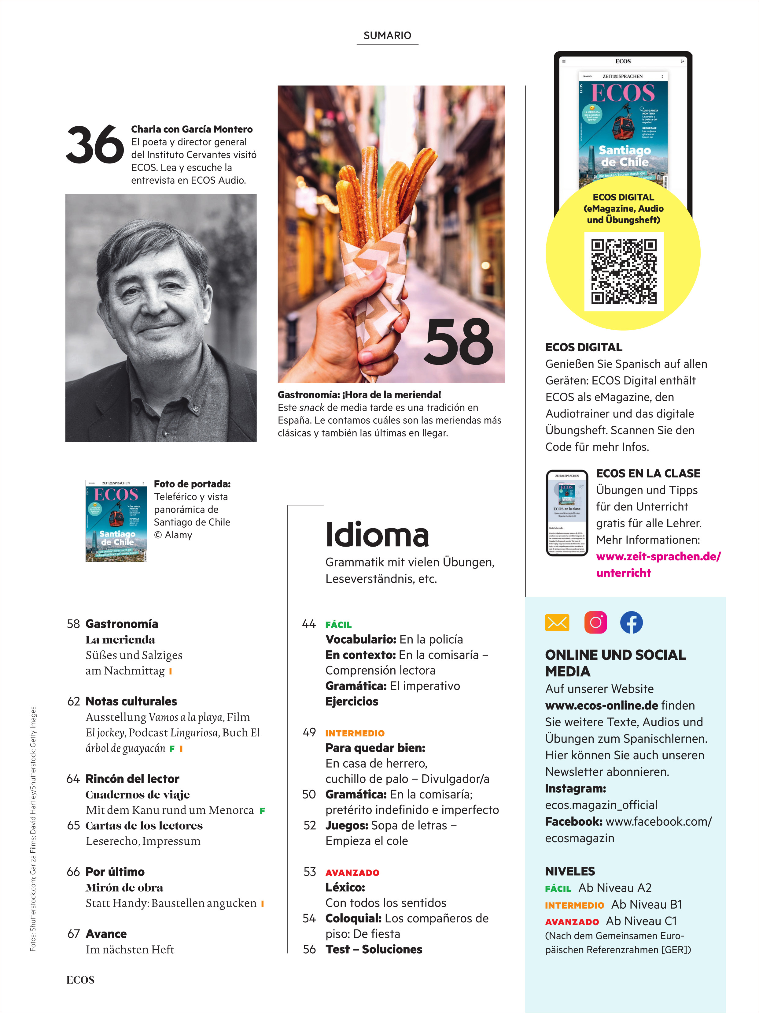 Ob Spanien oder Lateinamerika: Ecos nimmt Sie mit auf eine Reise durch die spanischsprachige Welt und zeigt Ihnen die schönsten Orte, beeindruckende Kulturen und kulinarische Besonderheiten. Ganz nebenbei verbessern Sie zudem umfassend Ihr sprachliches Know-How durch Wortschatz-, Grammatik- und Vokabelübungen.