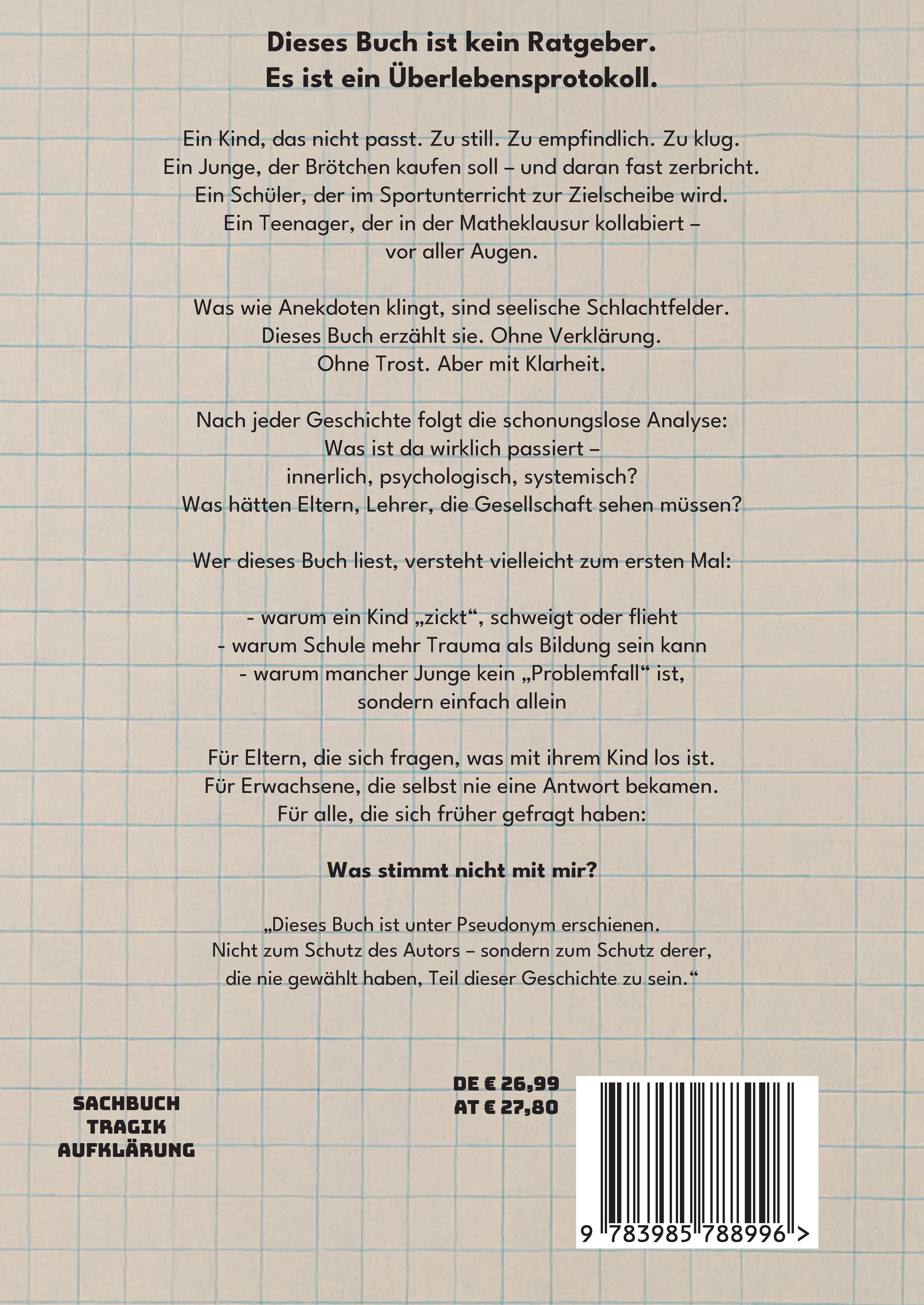 Radikal ehrliches Buch über Kindheit, Isolation und das Scheitern am Funktionieren – für alle, die sich je falsch gefühlt haben. Keine Therapie. Keine Ausflüchte. Nur Wahrheit.