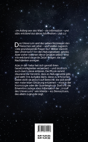 »Im Anfang war das Wort – die Information – und alles entstand aus dieser Information« (Joh 1,1) Das Universum und das Leben faszinieren den Menschen seit jeher – und werfen zugleich viele grundlegende Fragen auf. Woher stammt das Universum? Von den Naturgesetzen, gewiss. Aber woher kommen diese Gesetze selbst? Und wie entstand die erste Zelle? Fragen, die zum Nachdenken anregen.
