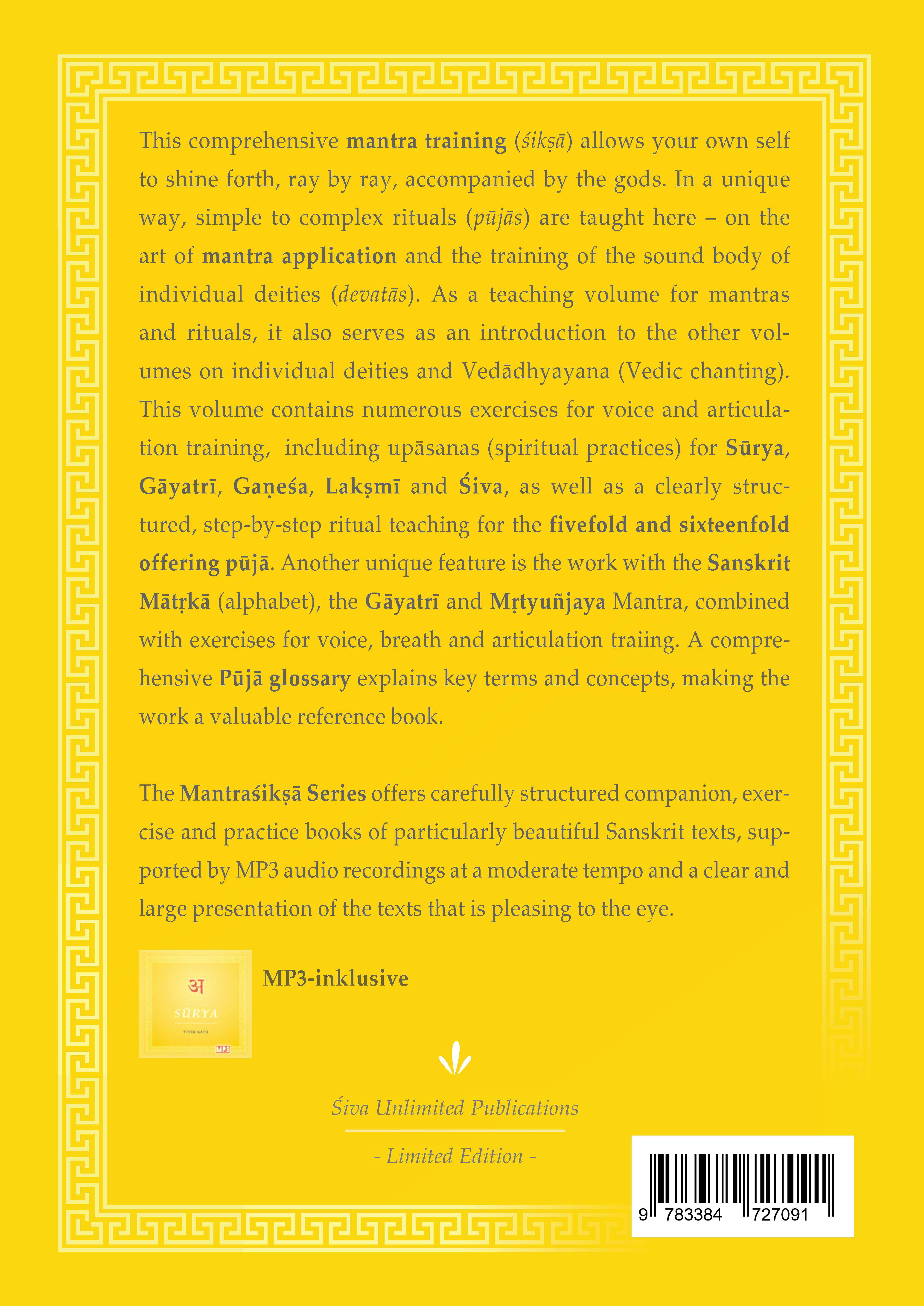 Experiencing Mantras - Step by Step in Practice and RitualThe second volume of the Mantrasiksa series is the comprehensive practice companion of the collection. It introduces the living world of mantras and unites recitation, breath, and voice training with a clearly structured teaching of puja. From simple preliminary exercises to complete sixteenfold offerings, it provides systematic instructions and spiritual upasanas for Surya, Gayatri, Ganesa, Laksmi, and Siva, as well as numerous recitation and practice exercises with the Sanskrit alphabet, the Gayatri and Mrtyuñjaya mantras.More than 120 MP3 recordings at a moderate tempo accompany the practices. With its clear layout and pleasantly large typeface, this volume is especially suited for personal study and daily practice. Together with an extensive puja glossary, it becomes a valuable manual for learning, practice, and reference - ideal both for beginners taking their first steps in recitation and ritual, and for experienced practitioners wishing to deepen and systematically expand their spiritual practice.