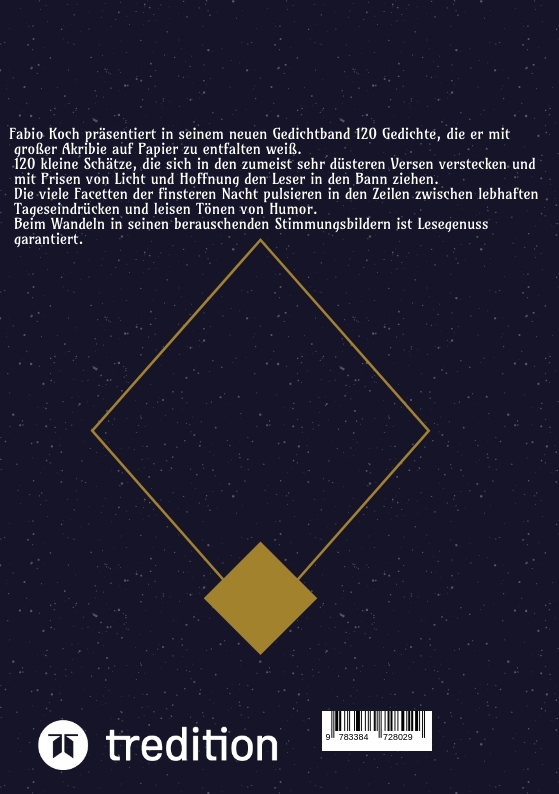 Fabio Koch präsentiert in seinem neuen Gedichtband 120 Gedichte, die er mit großer Akribie und Hingabe auf Papier zu entfalten weiß.120 kleine Schätze, die sich in den zumeist sehr düsteren Versen verstecken und mit Prisen von Licht und Hoffnung den Leser in den Bann ziehen.Die vielen Facetten der finsteren Nacht pulsieren in den Worten zwischen lebhaften Tageseindrücken und leisen Tönen von Humor.Beim Wandeln in seinen berauschenden Stimmungsbildern ist Lesegenuss garantiert.