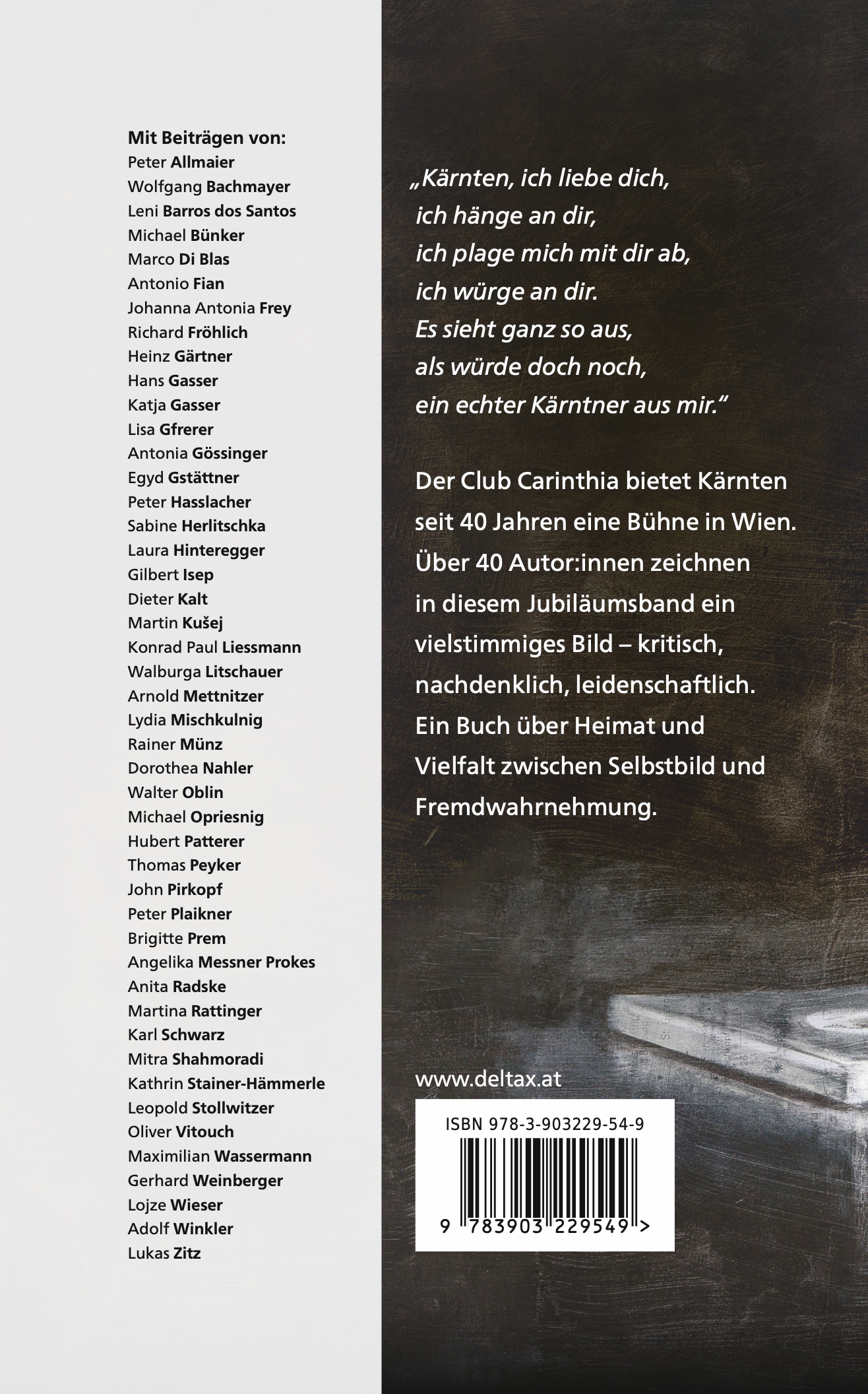 Seit 40 Jahren bietet der Club Carinthia Kärnten in Wien eine Bühne. Zum Jubiläum erscheint ein Sammelband mit mehr als 40 Beiträgen, die ein vielstimmiges Bild des Landes zeichnen – kritisch, nachdenklich, leidenschaftlich. Persönliche Erinnerungen und politische Reflexionen, Literatur, Geschichte, Wirtschaft, Kultur und Sport verbinden sich zu einem Kaleidoskop der Kärntner Identität. Manche Stimmen blicken nostalgisch zurück, andere fragen nach Chancen für die Zukunft. Entstanden ist ein facettenreiches Porträt eines Landes, das immer wieder neu verhandelt und leidenschaftlich diskutiert wird.