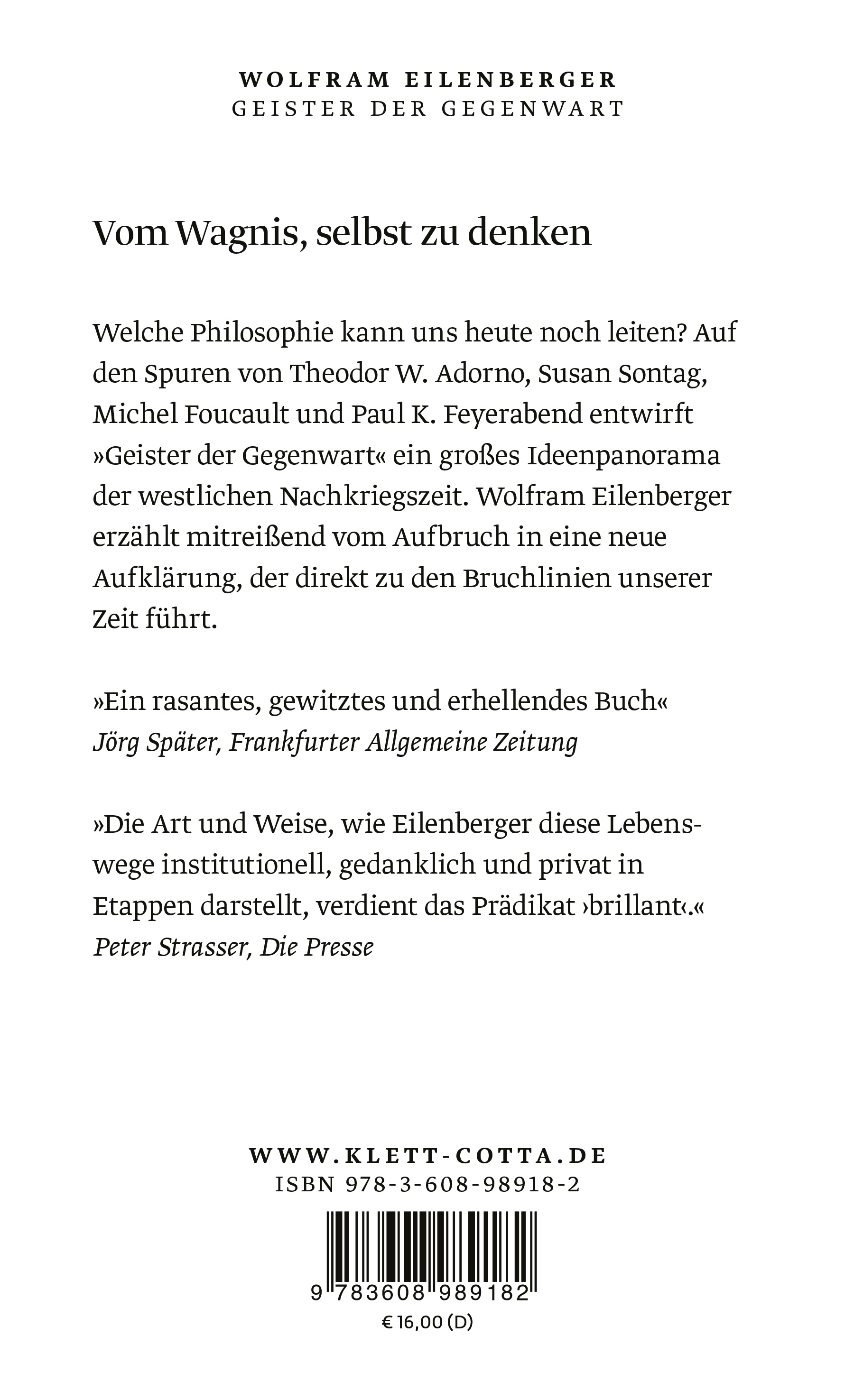 Welche Philosophie kann uns heute noch leiten? Auf den Spuren von Theodor W. Adorno, Susan Sontag, Michel Foucault und Paul K. Feyerabend entwirft »Geister der Gegenwart» ein großes Ideenpanorama der westlichen Nachkriegszeit. Wolfram Eilenberger erzählt mitreißend vom Aufbruch in eine neue Aufklärung, der direkt zu den Bruchlinien unserer Zeit führt.