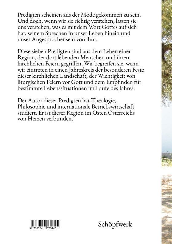 Dieses Buch enthält sieben Predigten aus sieben speziellen Gottesdiensten einer Region im Osten Österreichs, dem Burgenland. Sie sollen die Eigenart und die besonderen Feiern im Laufe eines Kirchenjahres aufzeigen, in dem sie sich auf den Inhalt der Feste und ihrer Einbettung im Leben der Menschen und den kulturellen Ausdrucksweisen in religiöser Hinsicht beziehen. Diese Feiern stehen aber nicht nur für sich allein oder in einem regionalen Kontext, sondern sind Teil eines jeden menschlichen Lebens, wenn wir sie umfassend verstehen.