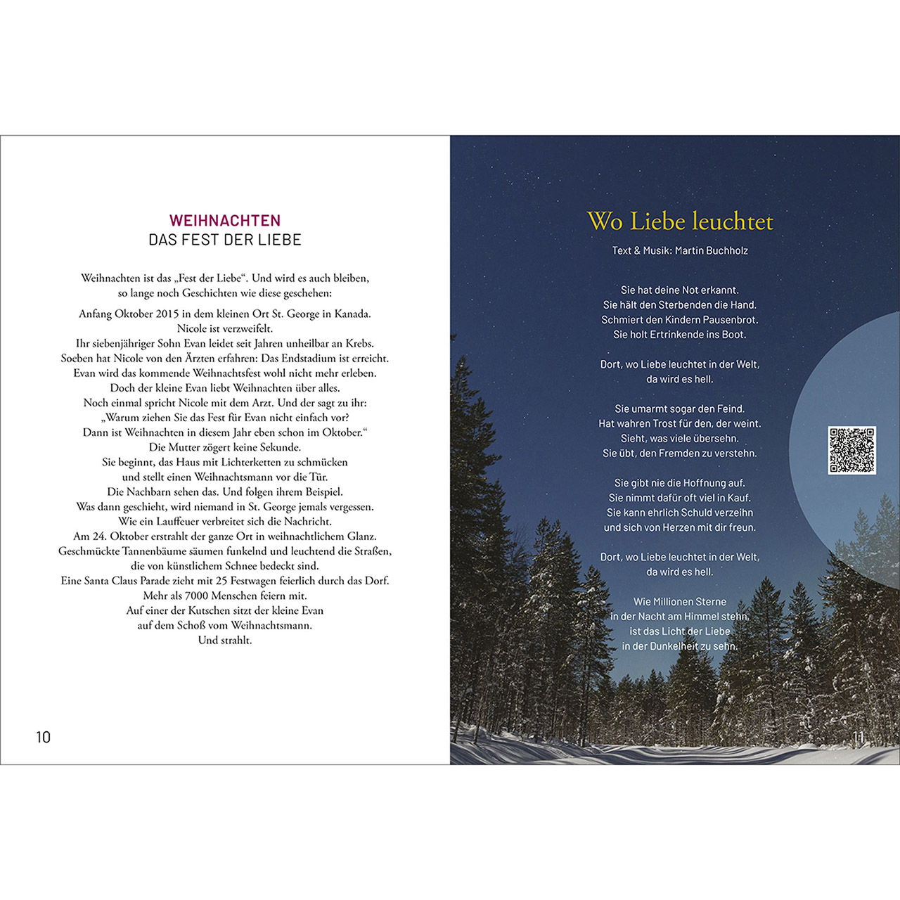 Bewegende Geschichten und Lieder. Wegbegleiter durch Jahr und Tag. Ein Streifzug durch unsere Lebensjahreszeiten. Vom Advent bis zum Ewigkeitssonntag. Von Abschied und Aufbruch, Trauer und Trost, Zweifel und Zuversicht. Alle 56 Lieder können über QR-Codes gestreamt werden. So wird dieses liebevoll gestaltete Buch auch zum Hörgenuss.