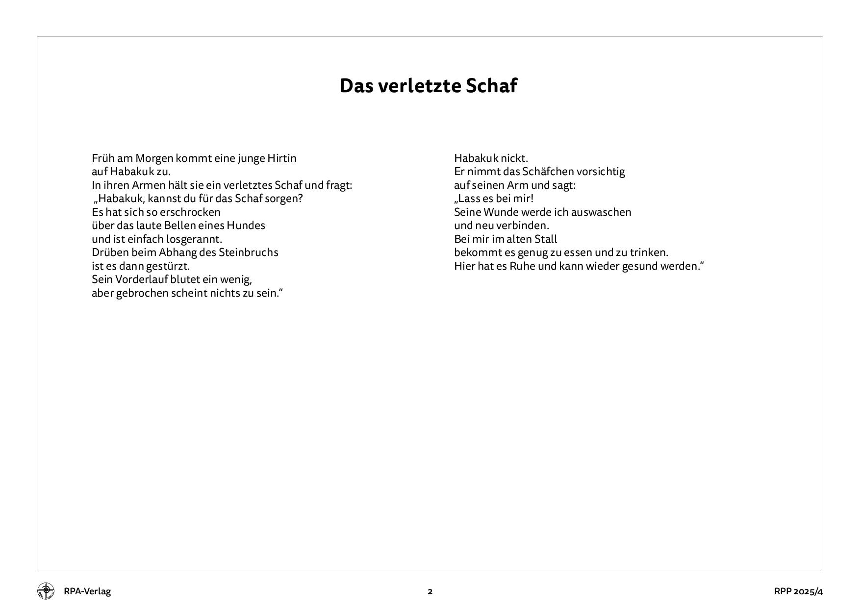 Mit 8 Bildern A4 und Erzähltexten auf der Rückseite wird die Geschichte von Habakuk und seinen Schafen bildhaft dargestellt. Im QR-Code sind Bilder, Lieder, Skizzen für die Figuren zu finden.