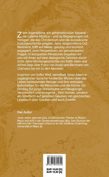 Zwei Jugendliche, ein geheimnisvoller Apparat – die Laterna Mystica – und 29 Begegnungen mit Heiligen, die das Christentum und die europäische Kulturgeschichte prägten. Jana, religionsferne Ost- Berlinerin, triff t auf Niklas, gläubig und kirchlich engagiert; zwei Perspektiven, ein gemeinsames Fragen. In kompakten Miniaturen begeben wir uns mit ihnen auf eine dialogische Zeitreise durch 2000 Jahre Kirchengeschichte von Edith Stein und Alfred Delp über Franz von Assisi und Bernhard von Clairvaux bis hin zu den Aposteln.