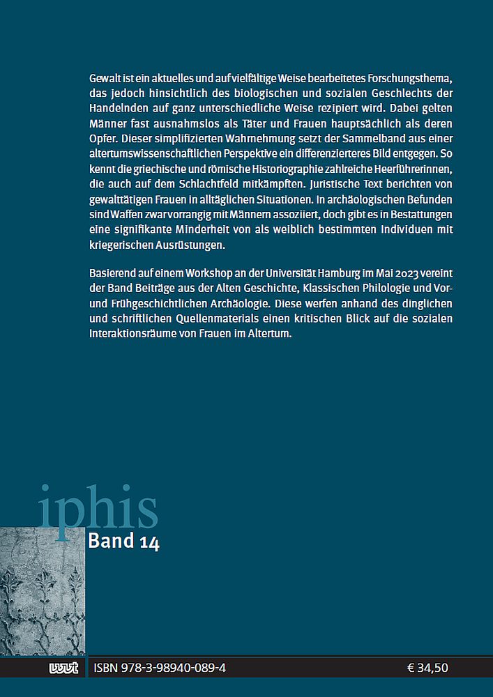 Gewalt ist ein aktuelles und auf vielfältige Weise bearbeitetes Forschungsthema, das jedoch hinsichtlich des biologischen und sozialen Geschlechts der Handelnden auf ganz unterschiedliche Weise rezipiert wird. Dabei gelten Männer fast ausnahmslos als Täter und Frauen hauptsächlich als deren Opfer. Dieser simplifizierten Wahrnehmung setzt der Sammelband aus einer altertumswissenschaftlichen Perspektive ein differenzierteres Bild entgegen. So kennt die griechische und römische Historiographie zahlreiche Heerführerinnen, die auch auf dem Schlachtfeld mitkämpften. Juristische Text berichten von gewalttätigen Frauen in alltäglichen Situationen. In archäologischen Befunden sind Waffen zwar vorrangig mit Männern assoziiert, doch gibt es in Bestattungen eine signifikante Minderheit von als weiblich bestimmten Individuen mit kriegerischen Ausrüstungen.