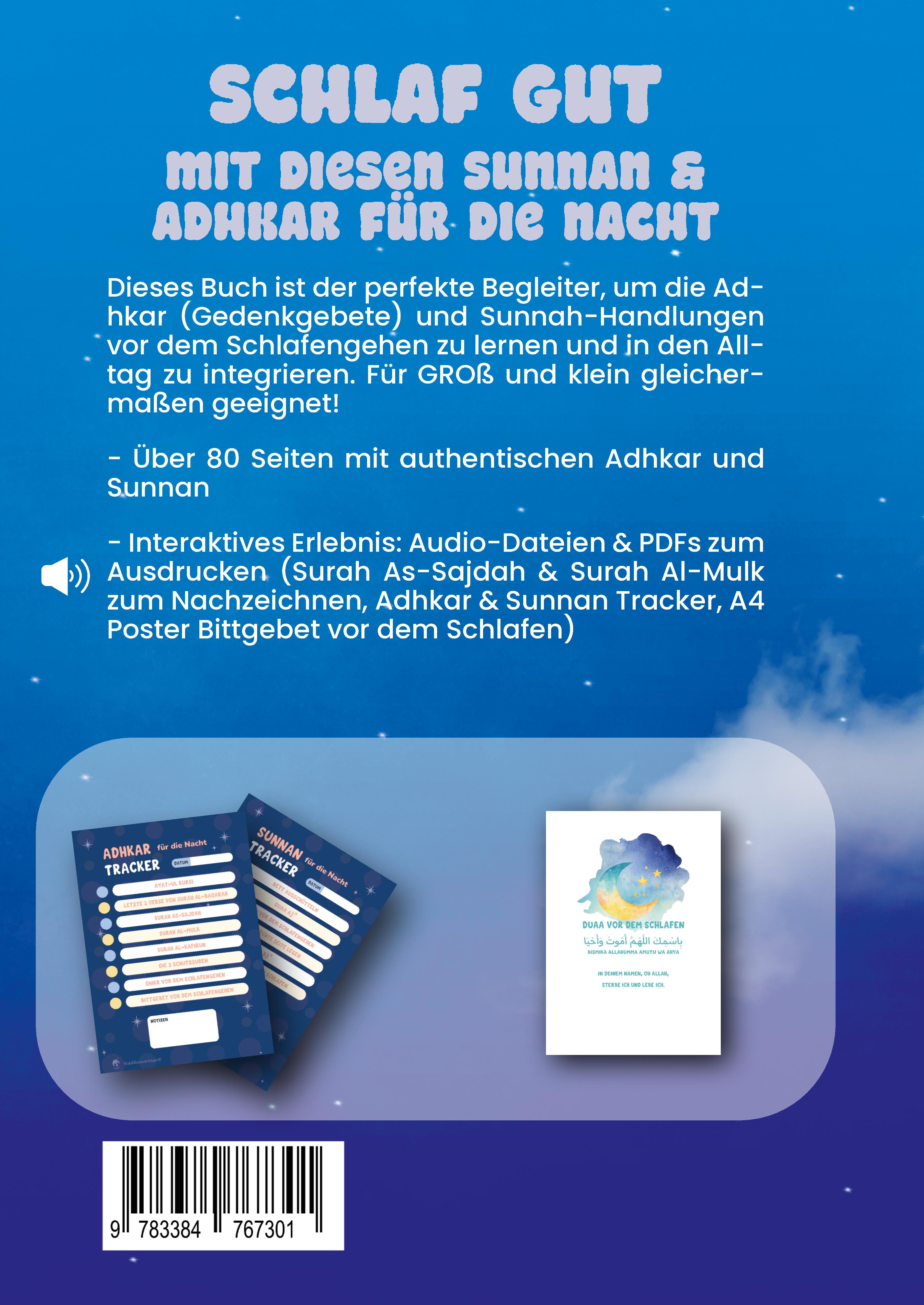 Dieses Buch ist der perfekte Begleiter, um die Adhkar (Gedenkgebete) und Sunnah-Handlungen vor dem Schlafengehen zu lernen und in den Alltag zu integrieren. Für GROß und klein gleichermaßen geeignet!- über 80 Seiten mit authentischen Adhkar und Sunnan - Interaktives Erlebnis: Audio-Dateien & PDFs zum Ausdrucken (Surah As-Sajdah & Surah Al-Mulk zum Nachzeichnen, Adhkar & Sunnan Tracker, A4 Poster Bittgebet vor dem Schlafen)- In Zusammenarbeit mit einem Quran-Lehrer, der die Rezitationen exklusiv für dieses Buch aufgenommen hat.Denke daran, dass ein Haus, in dem Allahs gedenkt wird, ein Haus voller Nour (Licht) ist. Also, bismillah - bist du bereit, es in die Routine deiner Familie einzuführen?