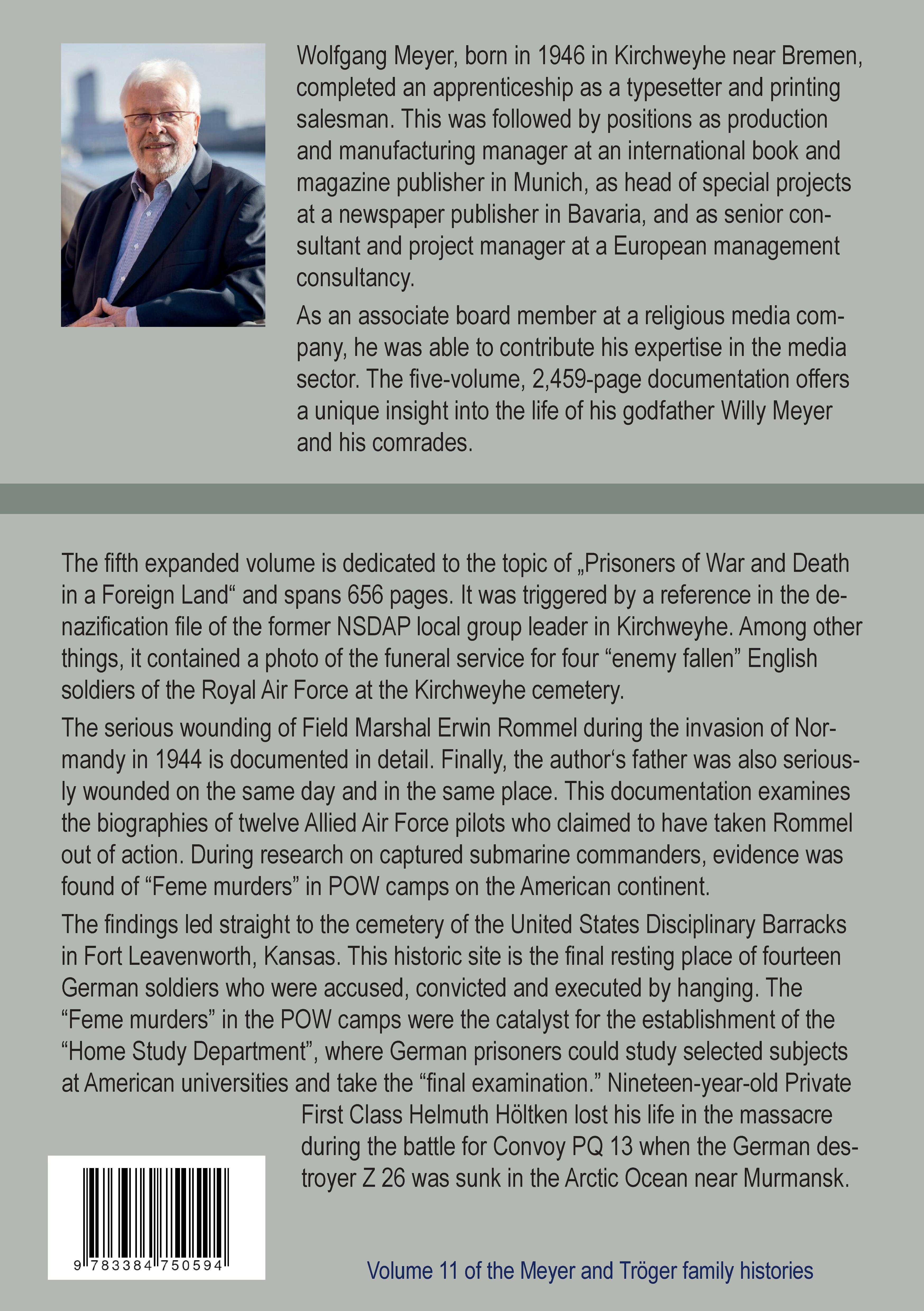 The fifth expanded volume is dedicated to the topic of "Prisoners of War and Death in a Foreign Land"and spans 656 pages. It was triggered by a reference in the denazification file of the former NSDAPlocal group leader in Kirchweyhe. Among other things, it contained a photo of the funeral servicefor four "enemy fallen" English soldiers of the Royal Air Force at the Kirchweyhe cemetery.The serious wounding of Field Marshal Erwin Rommel during the invasion of Normandy in 1944 is documented in detail. Finally, the author's father was also seriously wounded on the same day and in the same place. This documentation examines the biographies of twelve Allied Air Force pilots who claimed to have taken Rommel out of action. During research on captured submarine commanders, evidence was found of "Feme murders" in POW camps on the American continent. The findings led directly to the cemetery of the United States Disciplinary Barracks in Fort Leavenworth, Kansas.This historic site is the final resting place of fourteen German soldiers who were accused, convicted and executed by hanging. The "Feme murders" in the POW camps were the catalyst for the establishment of the "Home StudyDepartment," where German prisoners could study selected subjects at American universitiesand take the "Final Examination." Nineteen-year-old Private First Class Helmuth Höltken lost his life in the massacre during the battle for Convoy PQ 13 when the German destroyer Z 26 was sunk in the Arctic Ocean near Murmansk.