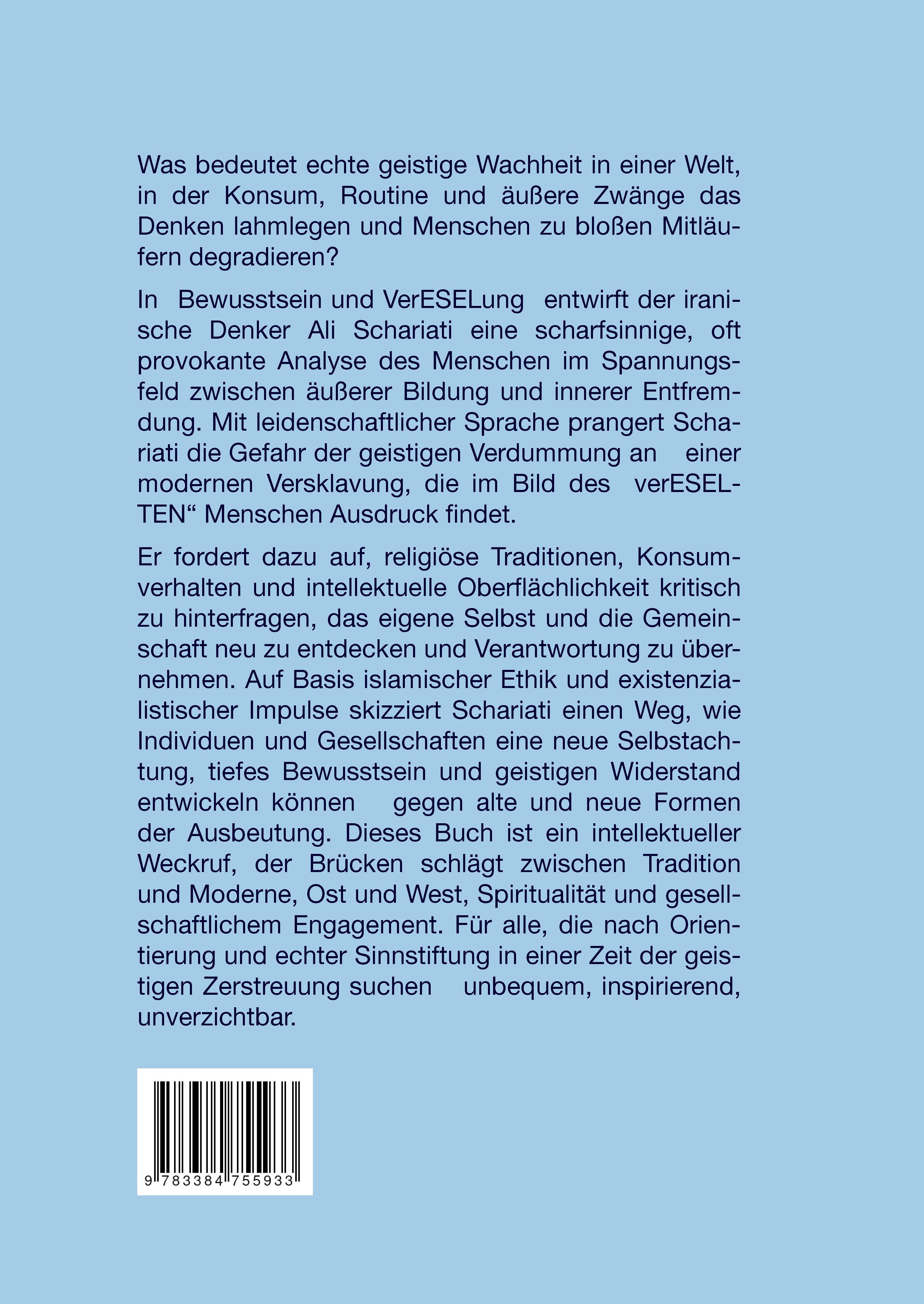 Was bedeutet echte geistige Wachheit in einer Welt, in der Konsum, Routine und äußere Zwänge das Denken lahmlegen und Menschen zu bloßen Mitläufern degradieren? In "Bewusstsein und VerESELung" entwirft der iranische Denker Ali Schariati eine scharfsinnige, oft provokante Analyse des Menschen im Spannungsfeld zwischen äußerer Bildung und innerer Entfremdung. Mit leidenschaftlicher Sprache prangert Schariati die Gefahr der geistigen Verdummung an - einer modernen Versklavung, die im Bild des "verESELTEN" Menschen Ausdruck findet. Er fordert dazu auf, religiöse Traditionen, Konsumverhalten und intellektuelle Oberflächlichkeit kritisch zu hinterfragen, das eigene Selbst und die Gemeinschaft neu zu entdecken und Verantwortung zu übernehmen. Auf Basis islamischer Ethik und existenzialistischer Impulse skizziert Schariati einen Weg, wie Individuen und Gesellschaften eine neue Selbstachtung, tiefes Bewusstsein und geistigen Widerstand entwickeln können - gegen alte und neue Formen der Ausbeutung. Dieses Buch ist ein intellektueller Weckruf, der Brücken schlägt zwischen Tradition und Moderne, Ost und West, Spiritualität und gesellschaftlichem Engagement. Für alle, die nach Orientierung und echter Sinnstiftung in einer Zeit der geistigen Zerstreuung suchen - unbequem, inspirierend, unverzichtbar.