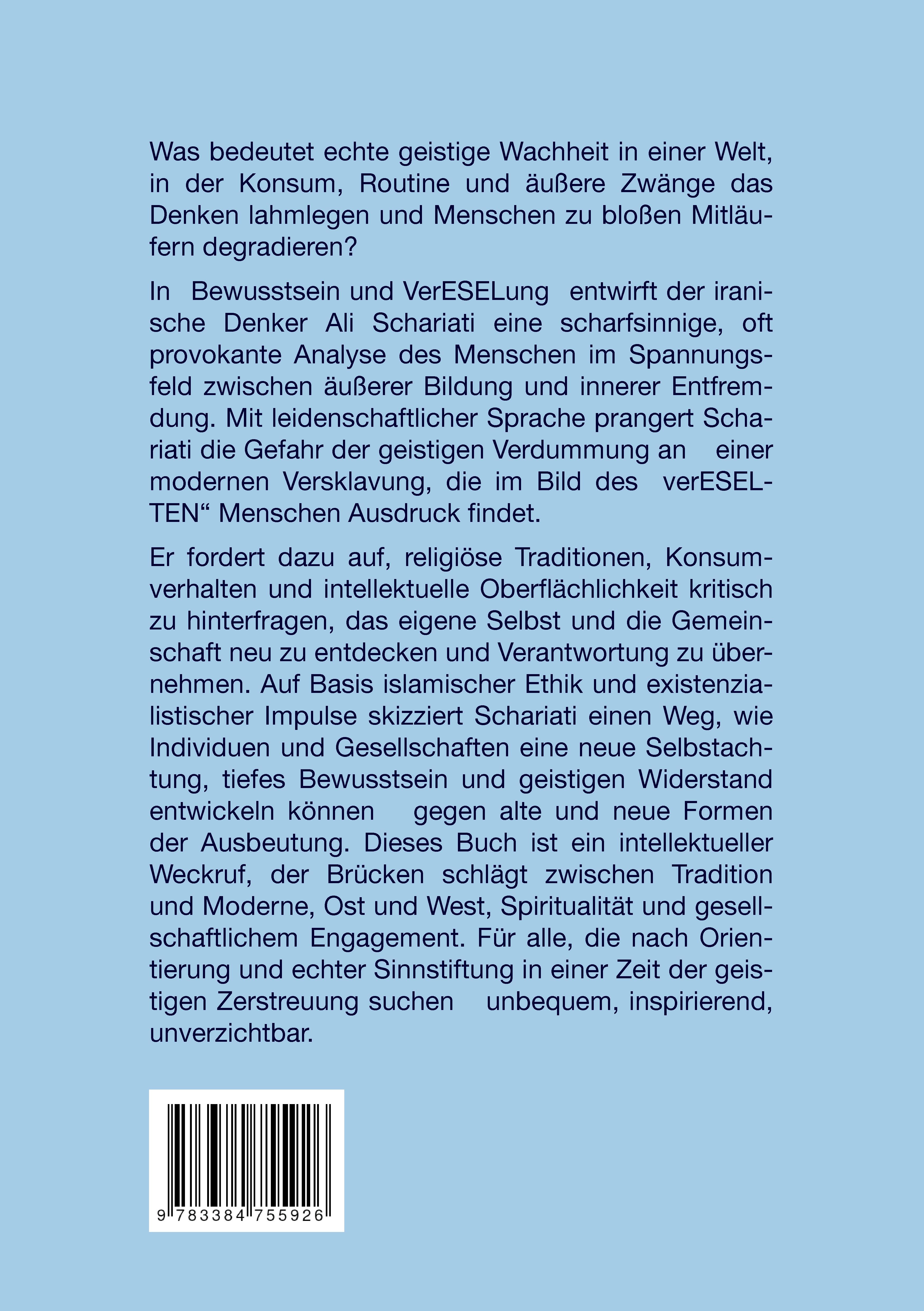 Was bedeutet echte geistige Wachheit in einer Welt, in der Konsum, Routine und äußere Zwänge das Denken lahmlegen und Menschen zu bloßen Mitläufern degradieren? In "Bewusstsein und VerESELung" entwirft der iranische Denker Ali Schariati eine scharfsinnige, oft provokante Analyse des Menschen im Spannungsfeld zwischen äußerer Bildung und innerer Entfremdung. Mit leidenschaftlicher Sprache prangert Schariati die Gefahr der geistigen Verdummung an - einer modernen Versklavung, die im Bild des "verESELTEN" Menschen Ausdruck findet. Er fordert dazu auf, religiöse Traditionen, Konsumverhalten und intellektuelle Oberflächlichkeit kritisch zu hinterfragen, das eigene Selbst und die Gemeinschaft neu zu entdecken und Verantwortung zu übernehmen. Auf Basis islamischer Ethik und existenzialistischer Impulse skizziert Schariati einen Weg, wie Individuen und Gesellschaften eine neue Selbstachtung, tiefes Bewusstsein und geistigen Widerstand entwickeln können - gegen alte und neue Formen der Ausbeutung. Dieses Buch ist ein intellektueller Weckruf, der Brücken schlägt zwischen Tradition und Moderne, Ost und West, Spiritualität und gesellschaftlichem Engagement. Für alle, die nach Orientierung und echter Sinnstiftung in einer Zeit der geistigen Zerstreuung suchen - unbequem, inspirierend, unverzichtbar.
