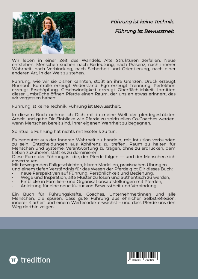Neues Sachbuch verbindet Leadership, systemische Aufstellungen und Spiritualität:"Pferde als spirituelle Co-Coaches" von Kerstin Staupendahl Mit "Pferde als spirituelle Co-Coaches - Wie pferdegestützte Transformation, systemische Aufstellungen und spirituelle Führung Menschen und Organisationen verändern" veröffentlicht die Coachin, Mediatorin und internationale Ausbildungsleiterin Kerstin Staupendahl ein außergewöhnliches Buch, das moderne Persönlichkeitsentwicklung neu denkt.Die Autorin schafft es, jahrzehntelange Erfahrung in pferdegestützter Arbeit mit neuesten Erkenntnissen aus Psychologie, Nervensystemforschung, systemischer Theorie, Embodiment und Leadership zu verbinden - und zeigt, wie Pferde Menschen dabei unterstützen, innere Klarheit, Selbstführung und emotionale Stabilität zu entwickeln.________________________________________Ein Buch zur richtigen ZeitIn einer Welt, die zunehmend von Druck, Komplexität und Beschleunigung geprägt ist, wächst das Bedürfnis nach echter Präsenz, Verbundenheit und sinnorientierter Führung."Pferde folgen keinem Titel, keinem Status und keiner Rolle. Sie folgen Klarheit. Und sie spiegeln unbestechlich, wenn wir sie verlieren."Ihr Buch zeigt, wie Menschen - privat wie beruflich - durch den Kontakt mit Pferden wieder Zugang zu ihrer inneren Führung finden. Nicht als Methode, sondern als Bewusstseinszustand.________________________________________Ein neues Verständnis von Führung und innerer ArbeitDas Werk richtet sich an:-Führungskräfte und Teams,-Coaches, Therapeut:innen und Mediator:innen,-Menschen in Veränderungsprozessen,-Pferdemenschen und spirituell Suchende,-Organisationen, die neue Formen der Zusammenarbeit erkunden.Zentrale Themen sind u. a.:-Resonanz und Körpersprache als tiefste Form der Kommunikation-systemische Dynamiken, Rollen und verdeckte Loyalitäten-Selbstwertarbeit nach Heinz-Peter Röhr-Nervensystemregulation und Embodiment-Stressmuster, innere Antreiber und Resilienz-spirituelle Führung und die "Weisheit der Herde"-Ethik, Verantwortung und Pferdewohl in professionellen Kontexten-konkrete Rituale und Alltagspraxis für nachhaltige Veränderung________________________________________Ein Buch, das Theorie und Praxis verbindetBesonders hervorzuheben sind die Fallbeispiele, in denen Pferde, menschliche Stellvertreter:innen und systemische Felder zusammenwirken. Leser:innen erleben hautnah, wie Pferde verdeckte Dynamiken sichtbar machen und wie sich innere Ordnung im Körper spürbar verändert.Das Buch bietet darüber hinaus:-praxistaugliche Mikro-Rituale für den Alltag-Körperübungen und Atemtechniken-Mini-Aufstellungen für Zuhause-Reflexionsfragen für Beziehung, Führung und Selbstwert________________________________________Über die AutorinKerstin Staupendahl ist Coachin, Mediatorin, Yogalehrerin, Ausbilderin und Leiterin des internationalen horsesense Netzwerks pferdegestützter Coaches.Mit jahrelanger Erfahrung in Einzelcoachings, Teamprozessen, systemischen Aufstellungen und Unternehmensbegleitung vereint sie Wissenschaft, Spiritualität und Naturverbundenheit zu einem einzigartigen Ansatz. Ihre Arbeit gilt als tief, präzise, warm, klar und höchst wirksam.________________________________________
