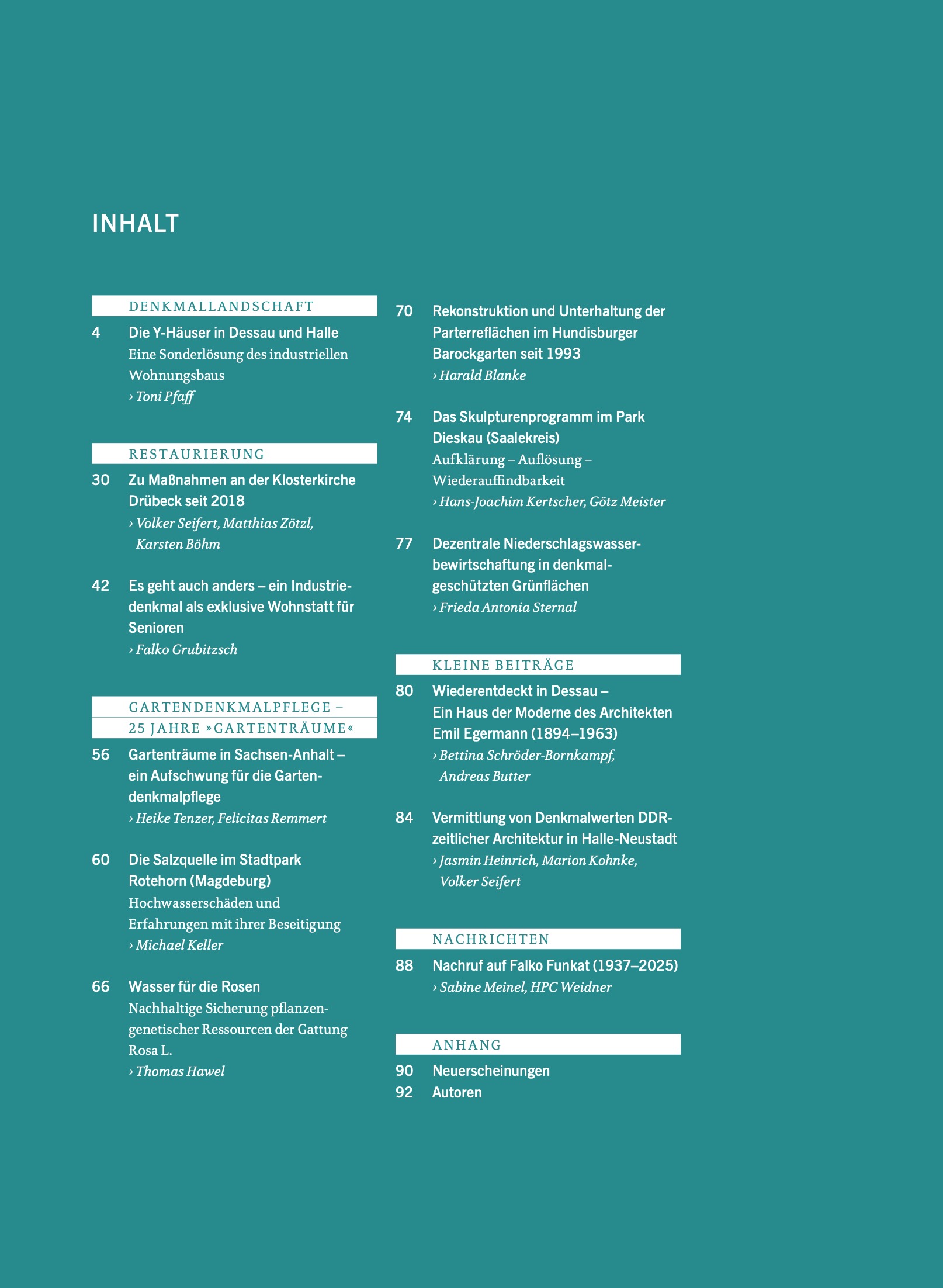 Band 2025-2 wird eröffnet mit einem umfassenden Beitrag zu den sog. Y-Häusern, überraschend individuellen Hochhauslösungen um 1970 in der DDR, mit denen einerseits Sensibilität für die Struktur neu entstehender Stadtteile gezeigt und andererseits Anschluss an internationale Tendenzen modernen Bauens gesucht wurde. Weitere ausführliche Beiträge gehen auf die Sanierung der bedeutenden, jedoch nässegefährdeten Klosterkirche Drübeck sowie den vorbildhaften Umbau einer traditionsreichen Osterwiecker Druckerei in eine Seniorenresidenz ein.