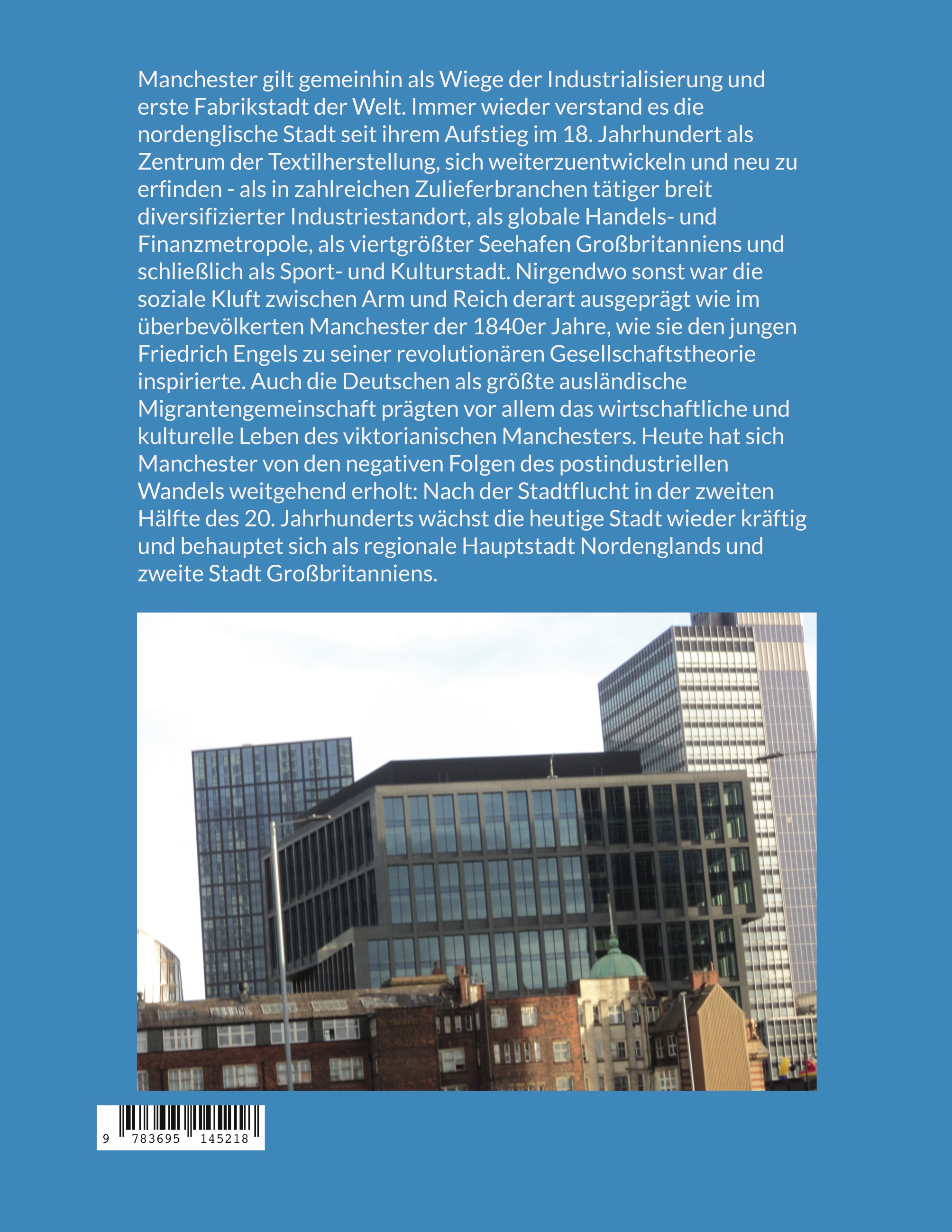Manchester gilt gemeinhin als Wiege der Industrialisierung und erste Fabrikstadt der Welt. Immer wieder verstand es die nordenglische Stadt seit ihrem Aufstieg im 18. Jahrhundert als Zentrum der Textilherstellung, sich weiterzuentwickeln und neu zu erfinden - als in zahlreichen Zulieferbranchen tätiger breit diversifizierter Industriestandort, als globale Handels- und Finanzmetropole, als viertgrößter Seehafen Großbritanniens und schließlich als Sport- und Kulturstadt. Nirgendwo sonst war die soziale Kluft zwischen Arm und Reich derart ausgeprägt wie im überbevölkerten Manchester der 1840er Jahre, wie sie den jungen Friedrich Engels zu seiner revolutionären Gesellschaftstheorie inspirierte. Auch die Deutschen als größte ausländische Migrantengemeinschaft prägten vor allem das wirtschaftliche und kulturelle Leben des viktorianischen Manchesters. Heute hat sich Manchester von den negativen Folgen des postindustriellen Wandels weitgehend erholt: Nach der Stadtflucht in der zweiten Hälfte des 20. Jahrhunderts wächst die heutige Stadt wieder kräftig und behauptet sich als regionale Hauptstadt Nordenglands und zweite Stadt Großbritanniens.