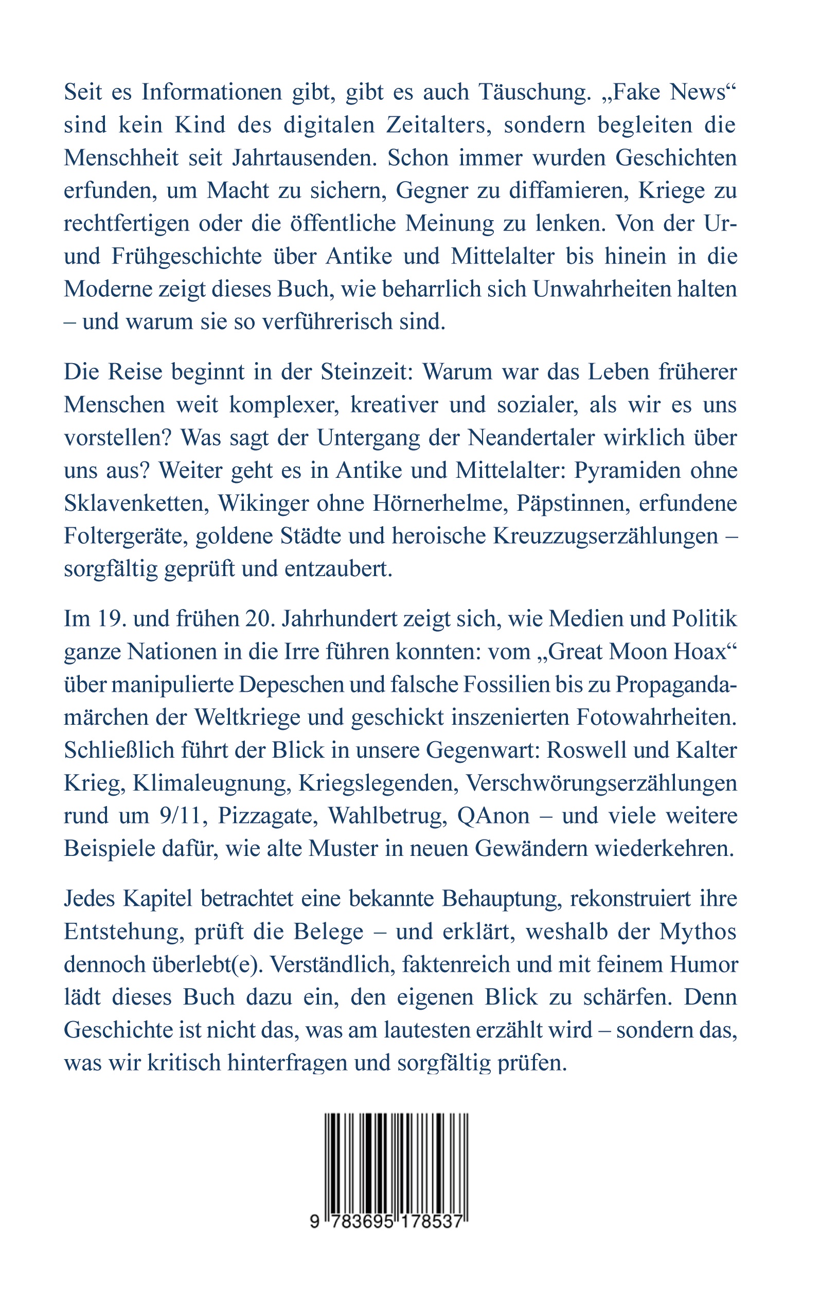 Seit es Informationen gibt, gibt es auch Täuschung. "Fake News" sind kein Kind des digitalen Zeitalters, sondern begleiten die Menschheit seit Jahrtausenden. Schon immer wurden Geschichten erfunden, um Macht zu sichern, Gegner zu diffamieren, Kriege zu rechtfertigen oder die öffentliche Meinung zu lenken. Von der Ur- und Frühgeschichte über Antike und Mittelalter bis hinein in die Moderne zeigt dieses Buch, wie beharrlich sich Unwahrheiten halten - und warum sie so verführerisch sind.