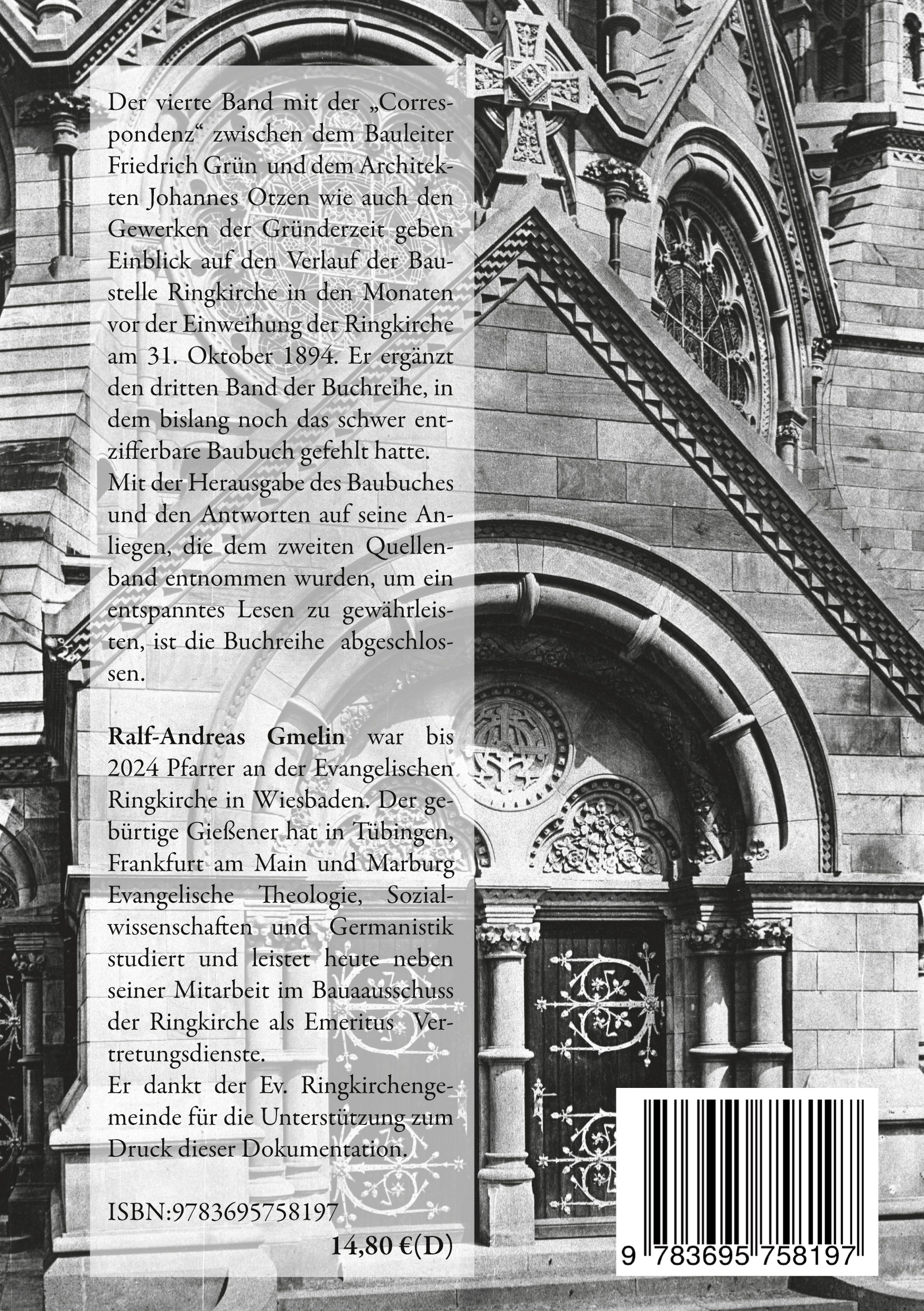 Der junge "Regierungs Bauführer" Friedrich Grün, übernahm von seinem Vorgänger Jacob Lieblein die Bauleitung des monumentalen Neubaus der Wiesbadener Ringkirche. Die Buchreihe publiziert die noch vorhandenen Quellen und macht die handschriftlichen Unterlagen zugänglich. Den bisherigen drei Bänden fehlte noch das in sehr schlechtem Zustand befindliche Baubuch, in dem die Schreiben des Bauleiters als Kohlekopie auf Transparentpapier verzeichnet sind. Dieser Mangel ist nun behoben. Für die entspanntere Lektüre wurden aus dem zweiten Quellenband Antwortschreiben eingefügt, damit der Ablauf der Korrespondenz nachvollziehbar wird.
