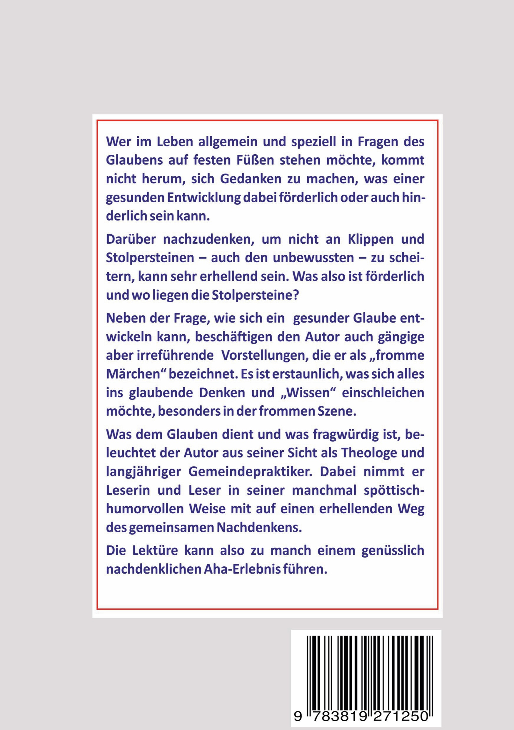Neben der Frage, wie sich ein gesunder Glaube entwickeln kann, beschäftigen den Autor auch gängige aber irreführende Vorstellungen, die er als "frommen Märchen" bezeichnet. Es ist erstaunlich, was sich alles ins glaubende Denken und "Wissen" einschleichen möchte, besonders in der frommen Szene.