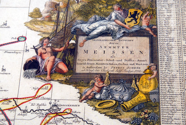 Die Karte wurde einst auf zwei Platten gedruckt, Reprint neu auf einem Blatt. Farbenprächtige Titelkartusche oben rechts von Nicolaas van Frankendaal gestochen. Zu sehen sind Allegorien mit Wappen, ein Elbschiff, Putten mit verschiedenen Stücken aus der Porzellan-Manufaktur Meissen. - Unten links u. rechts Erklärungen u. Anmerkung "Was vor Orte zum CREISSPROCUTRATUR=SCHUL- UND STIFFTS = AEMTERN MEISSEN gehören, dieses ist in der linckerhand am Rande befindlichen Register mit mehreren zu ersehen"Links und rechts neben der Karte je vierspaltige Schencktypische Suchregister.