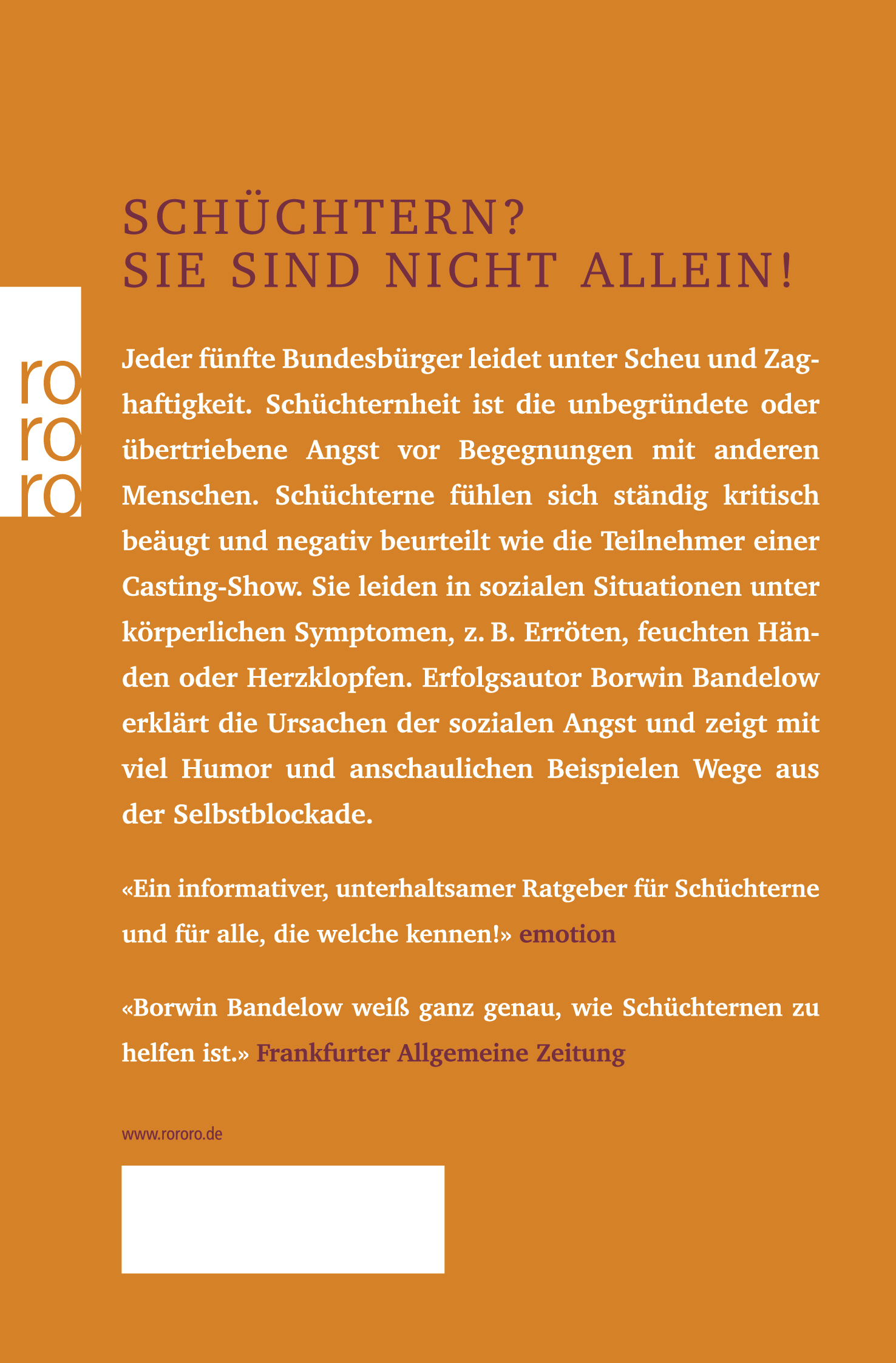 Schüchtern? Sie sind nicht allein!Jeder fünfte Bundesbürger leidet unter Scheu und Zaghaftigkeit. Schüchternheit ist die unbegründete oder übertriebene Angst vor Begegnungen mit anderen Menschen. Schüchterne fühlen sich ständig kritisch beäugt und negativ beurteilt wie die Teilnehmer einer Casting-Show. Sie leiden in sozialen Situationen unter körperlichen Symptomen, z.B. Erröten, feuchten Händen oder Herzklopfen. Erfolgsautor Borwin Bandelow erklärt die Ursachen der sozialen Angst und zeigt mit viel Humor und anschaulichen Beispielen Wege aus der Selbstblockade.«Ein informativer, unterhaltsamer Ratgeber für Schüchterne und für alle, die welche kennen!»emotion«Borwin Bandelow weiß ganz genau, wie Schüchternen zu helfen ist.» Frankfurter Allgemeine Zeitung