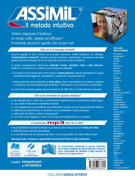 Deutschkurs in italienischer Sprache, Lehrbuch (Niveau A1- B2) mit mp3-CD"Il Tedesco" ist der richtige Selbstlernkurs sowohl für Lerner, die noch kein Wort Deutsch verstehen als auch für alle, die Ihre Deutschkenntnisse vertiefen und festigen möchten. Die bewährte ASSiMiL-Methode basiert auf dem Prinzip des natürlichen Assimilierens, d.h., man lernt eine Fremdsprache auf ganz ähnliche Weise, wie man schon als Kind die eigene Muttersprache erlernt hat. Die Methode ermöglicht es, sich Grammatik und Wortschatz ohne lästiges Auswendiglernen anzueignen. Das Lehrbuch ist in italienischer Sprache verfasst, wobei den deutschen Dialogtexten und Übungen die entsprechenden Übersetzungen und Erklärungen gegenüberstehen. Die verwendete Lautschrift wurde speziell an die Bedürfnisse des italienischen Lerners angepasst. Die in der Box enthaltene CD enthält alle deutschsprachigen mp3-Tonaufnahmen (Lektionen, Dialoge und Verständnisübungen). Die Aufnahmen wurden ausschließlich mit Muttersprachlern (allesamt professionelle Sprecherinnen und Sprecher) produziert. Die Sprechgeschwindigkeit ist dem jeweiligen Lektionsniveau angepasst. Die mp3-CD (180 Minuten vertonte Dialoge) enthält im Einzelnen: Audio-Dateien mit Lektionen und Übungen "komplett" als auch "Satz für Satz". Bei mp3-Abspielgeräten mit Display-Unterstützung oder am PC ist eine Anzeige der Dialog- und Übungssätze parallel zum Abspielen möglich. Ergänzender Text in italienischer SpracheUn corso sia per principianti che di ripasso: in qualche settimana sarete in grado di formulare le vostre prime frasi in tedesco e, dopo qualche mese, arriverete a conoscere un vocabolario "passivo" (termini che riuscite a capire) di oltre 2000 parole. Trascorso un anno, più di un terzo di questi vocaboli sarà sufficientemente assimilato e farà allora parte del vostro vocabolario "attivo" (termini che utilizzate parlando). La grammatica stessa, l'apprenderete progressivamente, in modo intuitivo, come un bambino che impara la sua lingua materna.Sprachen: Italienisch, Deutsch
