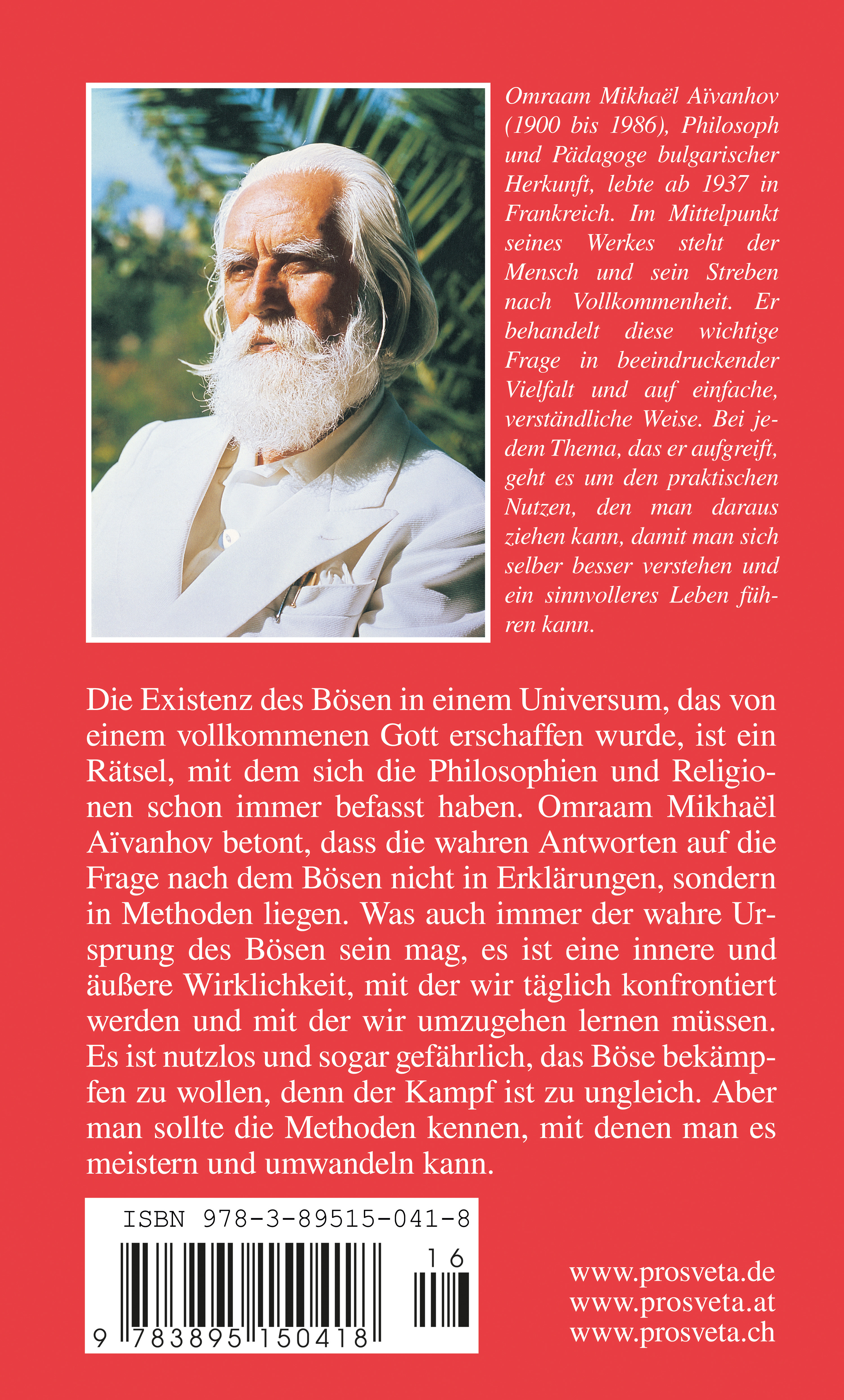 Die Existenz des Bösen in einem Universum, das von einem vollkommenen Gott erschaffen wurde, ist ein Rätsel, mit dem sich die Philosophien und Religionen schon immer befasst haben. Indem sich Omraam Mikhael Aivanhov auf das Wesentliche der jüdisch-christlichen Tradition beruft, legt er vor allem Nachdruck auf die Tatsache, dass die wahren Antworten auf die Frage nach dem Bösen nicht in Erklärungen liegen, sondern in Methoden. Was auch immer der wahre Ursprung des Bösen sein mag, es ist eine innere und äußere Wirklichkeit, mit der wir täglich konfrontiert werden und mit der wir unzugehen lernen müssen. Es ist nutzlos und sogar gefährlich, das Böse bekämpfen zu wollen, denn der Kampf ist zu ungleich. Aber man sollte die Methoden kennen, mit denen man es meistern und umwandeln kann.