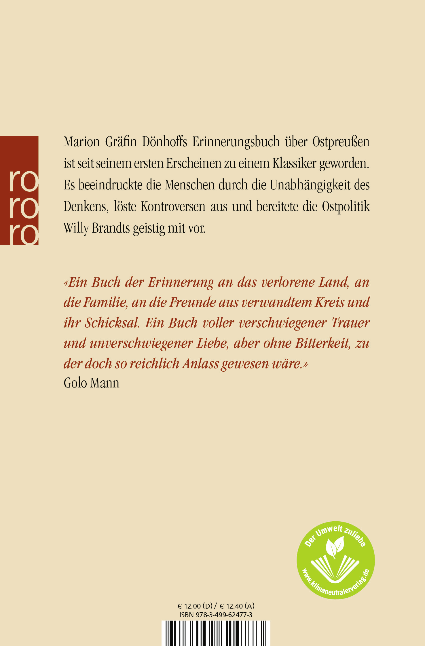 lt;p>Marion Gräfin Dönhoffs Erinnerungsbuch über Ostpreußen ist seit seinem ersten Erscheinen zu einem Klassiker geworden. Es beeindruckte die Menschen durch die Unabhängigkeit des Denkens, löste Kontroversen aus und bereitete die Ostpolitik Willy Brandts geistig mit vor.