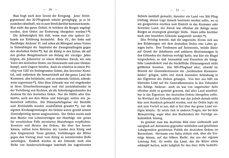 Das burzenländische Unternehmen S. 5 ff. Die Privilegien des Königs Andreas II. von Ungarn S. 5. - Rechtsstellung des burzenländischen Ordensgebiets S. 6. - Exemtion und Sprengung des Diözesanverbands S. 7. - Eigen des h. Petrus S. 8. - Ungarische Reaktion und Vertreibung des Ordens S. 9. - Das ungarische Privileg für die Johanniter von 1247 im Vergleich mit den Privilegien für den deutschen Orden S. 10. - Der Orden erstrebt einen autonomen Staat S. 11. - Er erstrebt in Preußen zuerst kaiserlichen Schutz und Klarheit über die Rechtsnatur der Privilegierung S. 12. - Das Privileg Friedrichs II. vom Jahre 1226 S. 12 ff. Privilegierung für die Zukunft S. 13. - Die Verhandlungen mit Konrad von Masovien über das Kulmerland bis zum Vertrage von Kruschwitz 1230 S. 13. - Friedrich II. begründet sein Verfügungsrecht über Preußen auf die universalistische Theorie vom allumfassenden Kaisertum und auf das Königsrecht am herrenlosen Land S. 14. - Die Kontroverse über die Stellung Preußens und des Hochmeisters zum Reich auf Grund des Privilegs von 1226. FICKER und WERMINGHOFF S. 15. - Die Lösung: der Hochmeister nicht Reichsfürst, sondern für die Zukunft privilegiert wie ein Reichsfürst S. 16. - Keine definitive Regelung der Stellung zum Reich aus bewusster Absicht Hermanns S. 17. - Das Privileg von 1226 als Aktionsprogramm Hermanns S. 18.